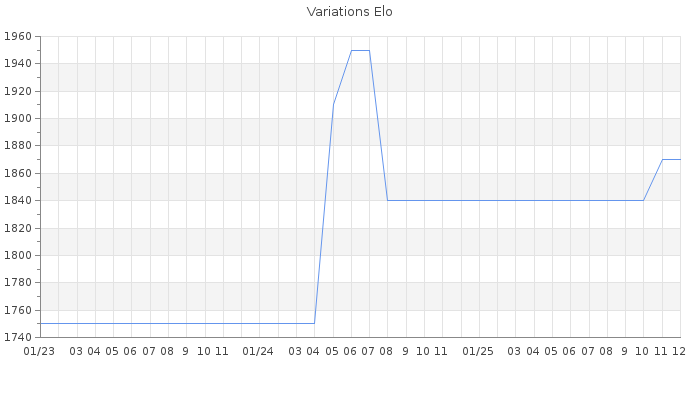 Date d'inscription : 15/02/08. Donateur pour EchecsEmail : Non ( Cliquez ici pour soutenir EchecsEmail. ) Elo non arrondi:1870.7 ( 194 sur 452 joueurs ) Nombre de victoires :227 Nombre de nulles :26 Nombre de défaites :240 Temps de réponse moyen par coup : 0J 16H 57M 5S ( Moyenne sur 75 coups ). Rd ( Un petit rd indique un elo fiable ) : 142 Magic Elo:1684.02 Magic Rd : 80 Elo maximum atteint ( en étant classé ) :2090 Elo maximum atteint cette année :1870 Nombre coups joués : 13803 Classement coupe : Inactif Points coupe : 0 Classement Coupe Magic Chess : Inactif Points Coupe Magic Chess : 0 Tournoi échelle : Inactif. Tournois gagnés : 09/06/2024 : Cat 3 : Victoire dans le tournoi n°25805 25/09/2018 : Cat 4 : Victoire dans le tournoi n°18409 07/09/2018 : Cat 3 : Victoire dans le tournoi n°18372 16/08/2018 : Cat 2 : Victoire dans le tournoi n°18347 17/03/2015 : Cat 3 : Victoire dans le tournoi n°17256 21/02/2012 : Cat 3 : Victoire dans le tournoi n°9495 13/01/2012 : Cat 3 : Victoire dans le tournoi n°9618 04/10/2010 : Cat 3 : Victoire dans le tournoi n°7786 09/12/2009 : Cat 4 : Victoire dans le tournoi n°6192 30/06/2009 : Cat 3 : Victoire dans le tournoi n°5897 16/01/2009 : Cat 3 : Victoire dans le tournoi n°5390 Nombre de tournois gagnés :11