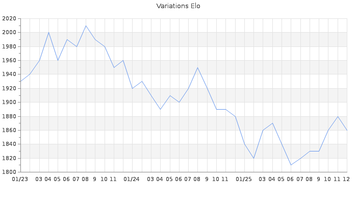 Date d'inscription : 12/11/13. Donateur pour EchecsEmail : Non ( Cliquez ici pour soutenir EchecsEmail. ) Elo non arrondi:1864.7 ( 196 sur 449 joueurs ) Nombre de victoires :313 Nombre de nulles :133 Nombre de défaites :258 Temps de réponse moyen par coup : 0J 9H 54M 6S ( Moyenne sur 802 coups ). Rd ( Un petit rd indique un elo fiable ) : 65 Magic Elo:1600 Magic Rd : 350 Elo maximum atteint ( en étant classé ) :2160 Elo maximum atteint cette année :1890 Nombre coups joués : 32687 Classement coupe : Inactif Points coupe : 0 Classement Coupe Magic Chess : Inactif Points Coupe Magic Chess : 0 Tournoi échelle : Inactif. Tournois gagnés : 12/03/2025 : Cat 4 : Victoire dans le tournoi n°26471 04/09/2024 : Cat 4 : Victoire dans le tournoi n°25924 04/09/2024 : Cat 4 : Victoire dans le tournoi n°25868 04/05/2024 : Cat 4 : Victoire dans le tournoi n°25686 09/03/2024 : Cat 4 : Victoire dans le tournoi n°25594 04/09/2023 : Cat 4 : Victoire dans le tournoi n°25135 19/07/2023 : Cat 4 : Victoire dans le tournoi n°24978 11/03/2023 : Cat 4 : Victoire dans le tournoi n°24454 22/05/2022 : Cat 4 : Victoire dans le tournoi n°23884 20/12/2021 : Cat 4 : Victoire dans le tournoi n°23279 25/09/2021 : Cat 4 : Victoire dans le tournoi n°22930 21/12/2020 : Cat 4 : Victoire dans le tournoi n°21852 08/05/2020 : Cat 4 : Victoire dans le tournoi n°21038 10/02/2020 : Cat 4 : Victoire dans le tournoi n°20433 02/01/2020 : Cat 4 : Victoire dans le tournoi n°20374 15/11/2019 : Cat 4 : Victoire dans le tournoi n°20250 06/10/2019 : Cat 4 : Victoire dans le tournoi n°19817 25/09/2019 : Cat 4 : Victoire dans le tournoi n°20087 23/07/2019 : Cat 4 : Victoire dans le tournoi n°19888 26/06/2019 : Cat 4 : Victoire dans le tournoi n°19637 07/06/2018 : Cat 4 : Victoire dans le tournoi n°18116 21/12/2017 : Cat 4 : Victoire dans le tournoi n°17377 24/04/2017 : Cat 4 : Victoire dans le tournoi n°16255 22/07/2016 : Cat 4 : Victoire dans le tournoi n°15030 19/06/2016 : Cat 4 : Victoire dans le tournoi n°14924 10/12/2015 : Cat 4 : Victoire dans le tournoi n°18889 21/11/2015 : Cat 4 : Victoire dans le tournoi n°18583 04/02/2015 : Cat 4 : Victoire dans le tournoi n°16451 26/01/2015 : Cat 4 : Victoire dans le tournoi n°16726 16/12/2014 : Cat 4 : Victoire dans le tournoi n°16609 17/08/2014 : Cat 4 : Victoire dans le tournoi n°15634 07/08/2014 : Cat 4 : Victoire dans le tournoi n°15478 07/03/2014 : Cat 3 : Victoire dans le tournoi n°14439 03/02/2014 : Cat 1 : Victoire dans le tournoi n°14202 Nombre de tournois gagnés :34