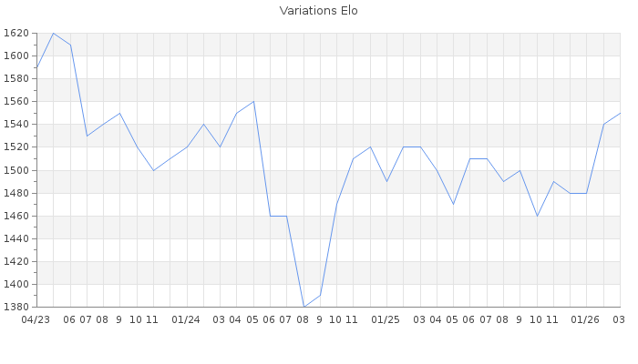 Date d'inscription : 01/02/09. Donateur pour EchecsEmail : Non ( Cliquez ici pour soutenir EchecsEmail. ) Elo non arrondi:1548 ( 336 sur 441 joueurs ) Nombre de victoires :739 Nombre de nulles :20 Nombre de défaites :815 Temps de réponse moyen par coup : 0J 18H 45M 44S ( Moyenne sur 605 coups ). Rd ( Un petit rd indique un elo fiable ) : 67 Magic Elo:1600 Magic Rd : 350 Elo maximum atteint ( en étant classé ) :1790 Elo maximum atteint cette année :1550 Nombre coups joués : 45717 Classement coupe : Inactif Points coupe : 0 Classement Coupe Magic Chess : Inactif Points Coupe Magic Chess : 0 Tournoi échelle : Inactif. Tournois gagnés : 24/12/2018 : Cat 1 : Victoire dans le tournoi n°19018 17/07/2015 : Cat 0 : Premier au tournoi multi Eté 2015 n°10 Nombre de tournois gagnés :2