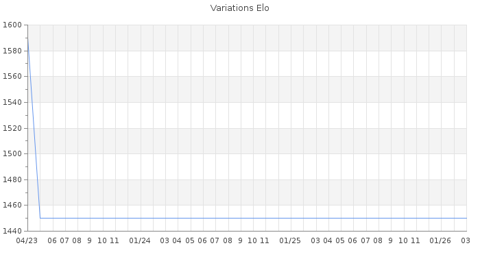 Date d'inscription : 06/02/21. Donateur pour EchecsEmail : Non ( Cliquez ici pour soutenir EchecsEmail. ) Elo non arrondi:1410.9 ( 475 sur 439 joueurs ) Nombre de victoires :11 Nombre de nulles :0 Nombre de défaites :8 Rd ( Un petit rd indique un elo fiable ) : 150 Elo maximum atteint ( en étant classé ) :1650 Elo maximum atteint cette année :0 Nombre coups joués : 514 Classement coupe : Inactif Points coupe : 0 Classement Coupe Magic Chess : Inactif Points Coupe Magic Chess : 0 Tournoi échelle : Tournois gagnés : 06/03/2021 : Cat 0 : Victoire dans le tournoi n°22417 Nombre de tournois gagnés :1