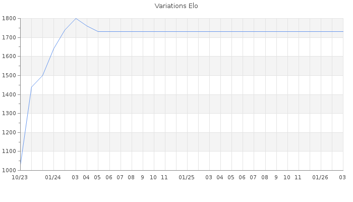 Date d'inscription : 27/10/23. Donateur pour EchecsEmail : Non ( Cliquez ici pour soutenir EchecsEmail. ) Elo non arrondi:1698.5 ( 294 sur 442 joueurs ) Nombre de victoires :30 Nombre de nulles :2 Nombre de défaites :8 Temps de réponse moyen par coup : 1J 1H 21M 2S ( Moyenne sur 0 coups ). Rd ( Un petit rd indique un elo fiable ) : 73 Elo maximum atteint ( en étant classé ) :1830 Elo maximum atteint cette année :0 Nombre coups joués : 894 Classement coupe : Inactif Points coupe : 0 Classement Coupe Magic Chess : Inactif Points Coupe Magic Chess : 0 Tournoi échelle : Nombre de tournois gagnés :0