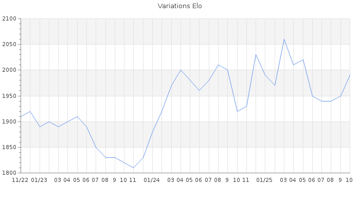 Date d'inscription : 04/12/18. Donateur pour EchecsEmail : Non ( Cliquez ici pour soutenir EchecsEmail. ) Elo non arrondi:1975.3 ( 135 sur 454 joueurs ) Nombre de victoires :328 Nombre de nulles :42 Nombre de défaites :329 Temps de réponse moyen par coup : 0J 6H 10M 15S ( Moyenne sur 577 coups ). Rd ( Un petit rd indique un elo fiable ) : 69 Elo maximum atteint ( en étant classé ) :2060 Elo maximum atteint cette année :2060 Nombre coups joués : 27158 Inscrit dans l' équipe:Royal Kids Classement coupe : Inactif Points coupe : 0 Classement Coupe Magic Chess : Inactif Points Coupe Magic Chess : 0 Tournoi échelle : Nombre de tournois gagnés :0