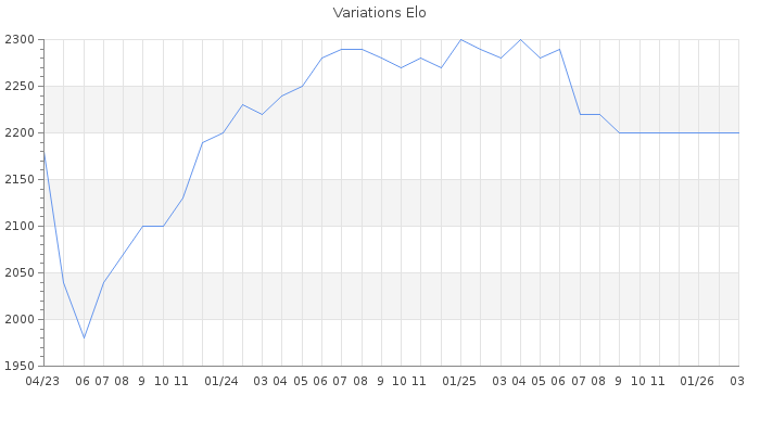 Date d'inscription : 29/09/22. Donateur pour EchecsEmail : Non ( Cliquez ici pour soutenir EchecsEmail. ) Elo non arrondi:2190.3 ( 65 sur 442 joueurs ) Nombre de victoires :213 Nombre de nulles :22 Nombre de défaites :109 Temps de réponse moyen par coup : 0J 8H 31M 47S ( Moyenne sur 61 coups ). Rd ( Un petit rd indique un elo fiable ) : 68 Elo maximum atteint ( en étant classé ) :2310 Elo maximum atteint cette année :0 Nombre coups joués : 10859 Classement coupe : Inactif Points coupe : 0 Classement Coupe Magic Chess : Inactif Points Coupe Magic Chess : 0 Tournoi échelle : Nombre de tournois gagnés :0