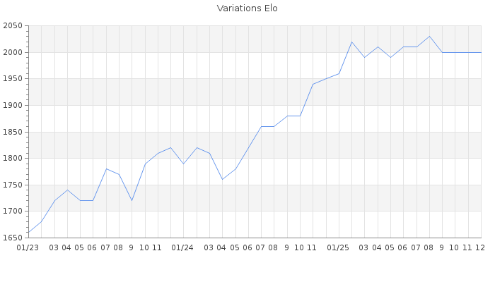 Date d'inscription : 07/05/20. Donateur pour EchecsEmail : Non ( Cliquez ici pour soutenir EchecsEmail. ) Elo non arrondi:1998.3 ( 131 sur 450 joueurs ) Nombre de victoires :197 Nombre de nulles :52 Nombre de défaites :117 Temps de réponse moyen par coup : 0J 18H 56M 36S ( Moyenne sur 64 coups ). Rd ( Un petit rd indique un elo fiable ) : 79 Magic Elo:1700 Magic Rd : 350 Elo maximum atteint ( en étant classé ) :2030 Elo maximum atteint cette année :2030 Nombre coups joués : 14544 Classement coupe : Inactif Points coupe : 0 Classement Coupe Magic Chess : Inactif Points Coupe Magic Chess : 0 Tournoi échelle : Tournois gagnés : 21/12/2024 : Cat 4 : Victoire dans le tournoi n°26140 01/08/2024 : Cat 4 : Victoire dans le tournoi n°25927 30/06/2024 : Cat 3 : Victoire dans le tournoi n°25894 12/02/2024 : Cat 4 : Victoire dans le tournoi n°25529 17/08/2023 : Cat 3 : Victoire dans le tournoi n°25092 20/07/2023 : Cat 3 : Victoire dans le tournoi n°25013 25/04/2023 : Cat 2 : Victoire dans le tournoi n°24737 16/04/2023 : Cat 2 : Victoire dans le tournoi n°24753 31/03/2023 : Cat 2 : Victoire dans le tournoi n°24691 24/02/2023 : Cat 2 : Victoire dans le tournoi n°24652 15/12/2022 : Cat 2 : Victoire dans le tournoi n°24420 01/04/2021 : Cat 2 : Victoire dans le tournoi n°22564 06/03/2021 : Cat 2 : Victoire dans le tournoi n°22496 18/02/2021 : Cat 2 : Victoire dans le tournoi n°22425 21/01/2021 : Cat 2 : Victoire dans le tournoi n°22272 27/12/2020 : Cat 2 : Victoire dans le tournoi n°22118 01/12/2020 : Cat 2 : Victoire dans le tournoi n°22056 25/11/2020 : Cat 2 : Victoire dans le tournoi n°22089 17/11/2020 : Cat 2 : Victoire dans le tournoi n°22037 10/11/2020 : Cat 2 : Victoire dans le tournoi n°21977 31/10/2020 : Cat 2 : Victoire dans le tournoi n°21952 Nombre de tournois gagnés :21