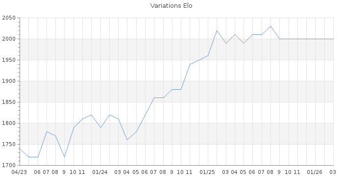 Date d'inscription : 07/05/20. Donateur pour EchecsEmail : Non ( Cliquez ici pour soutenir EchecsEmail. ) Elo non arrondi:1990.3 ( 131 sur 441 joueurs ) Nombre de victoires :197 Nombre de nulles :52 Nombre de défaites :117 Temps de réponse moyen par coup : 0J 18H 56M 36S ( Moyenne sur 15 coups ). Rd ( Un petit rd indique un elo fiable ) : 79 Magic Elo:1700 Magic Rd : 350 Elo maximum atteint ( en étant classé ) :2030 Elo maximum atteint cette année :0 Nombre coups joués : 14544 Classement coupe : Inactif Points coupe : 0 Classement Coupe Magic Chess : Inactif Points Coupe Magic Chess : 0 Tournoi échelle : Tournois gagnés : 21/12/2024 : Cat 4 : Victoire dans le tournoi n°26140 01/08/2024 : Cat 4 : Victoire dans le tournoi n°25927 30/06/2024 : Cat 3 : Victoire dans le tournoi n°25894 12/02/2024 : Cat 4 : Victoire dans le tournoi n°25529 17/08/2023 : Cat 3 : Victoire dans le tournoi n°25092 20/07/2023 : Cat 3 : Victoire dans le tournoi n°25013 25/04/2023 : Cat 2 : Victoire dans le tournoi n°24737 16/04/2023 : Cat 2 : Victoire dans le tournoi n°24753 31/03/2023 : Cat 2 : Victoire dans le tournoi n°24691 24/02/2023 : Cat 2 : Victoire dans le tournoi n°24652 15/12/2022 : Cat 2 : Victoire dans le tournoi n°24420 01/04/2021 : Cat 2 : Victoire dans le tournoi n°22564 06/03/2021 : Cat 2 : Victoire dans le tournoi n°22496 18/02/2021 : Cat 2 : Victoire dans le tournoi n°22425 21/01/2021 : Cat 2 : Victoire dans le tournoi n°22272 27/12/2020 : Cat 2 : Victoire dans le tournoi n°22118 01/12/2020 : Cat 2 : Victoire dans le tournoi n°22056 25/11/2020 : Cat 2 : Victoire dans le tournoi n°22089 17/11/2020 : Cat 2 : Victoire dans le tournoi n°22037 10/11/2020 : Cat 2 : Victoire dans le tournoi n°21977 31/10/2020 : Cat 2 : Victoire dans le tournoi n°21952 Nombre de tournois gagnés :21