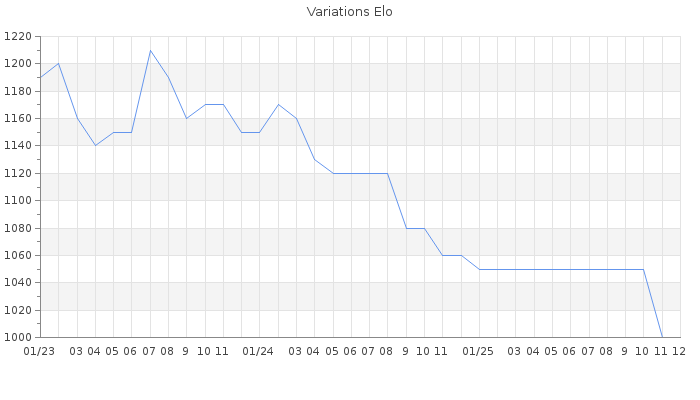 Date d'inscription : 08/01/20. Donateur pour EchecsEmail : Non ( Cliquez ici pour soutenir EchecsEmail. ) Elo non arrondi:1000 ( 447 sur 454 joueurs ) Nombre de victoires :40 Nombre de nulles :2 Nombre de défaites :92 Temps de réponse moyen par coup : 0J 7H 9M 5S ( Moyenne sur 5 coups ). Rd ( Un petit rd indique un elo fiable ) : 136 Magic Elo:1289.07 Magic Rd : 219 Elo maximum atteint ( en étant classé ) :1230 Elo maximum atteint cette année :1050 Nombre coups joués : 3614 Inscrit dans l' équipe:No Game No Life Classement coupe : Inactif Points coupe : 0 Classement Coupe Magic Chess : Inactif Points Coupe Magic Chess : 0 Tournoi échelle : Inactif. Nombre de tournois gagnés :0