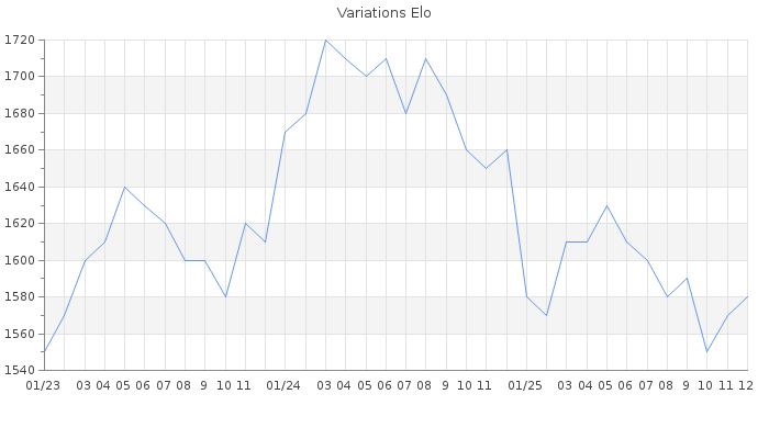 Date d'inscription : 23/03/09. Donateur pour EchecsEmail : Non ( Cliquez ici pour soutenir EchecsEmail. ) Elo non arrondi:1585 ( 331 sur 450 joueurs ) Nombre de victoires :905 Nombre de nulles :36 Nombre de défaites :906 Temps de réponse moyen par coup : 0J 15H 27M 53S ( Moyenne sur 343 coups ). Rd ( Un petit rd indique un elo fiable ) : 76 Magic Elo:1600 Magic Rd : 350 Elo maximum atteint ( en étant classé ) :1730 Elo maximum atteint cette année :1650 Nombre coups joués : 58453 Inscrit dans l' équipe:Vikings Classement coupe : Inactif, date de la dernière qualification : 04/05/24 Points coupe : 4.72 Classement Coupe Magic Chess : Inactif Points Coupe Magic Chess : 0 Tournoi échelle : Inactif. Tournois gagnés : 05/03/2024 : Cat 3 : Victoire dans le tournoi n°25523 22/01/2024 : Cat 2 : Victoire dans le tournoi n°25402 28/11/2023 : Cat 2 : Victoire dans le tournoi n°25324 22/09/2023 : Cat 2 : Victoire dans le tournoi n°24950 26/07/2023 : Cat 2 : Victoire dans le tournoi n°24981 21/01/2022 : Cat 2 : Victoire dans le tournoi n°23362 19/01/2022 : Cat 2 : Victoire dans le tournoi n°23277 30/07/2020 : Cat 2 : Victoire dans le tournoi n°21401 Nombre de tournois gagnés :8