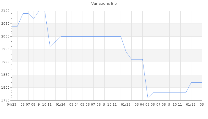 Date d'inscription : 10/03/12. Donateur pour EchecsEmail : Non ( Cliquez ici pour soutenir EchecsEmail. ) Elo non arrondi:1814.7 ( 212 sur 442 joueurs ) Nombre de victoires :219 Nombre de nulles :27 Nombre de défaites :89 Temps de réponse moyen par coup : 0J 12H 28M 22S ( Moyenne sur 62 coups ). Rd ( Un petit rd indique un elo fiable ) : 112 Magic Elo:1600 Magic Rd : 350 Elo maximum atteint ( en étant classé ) :2200 Elo maximum atteint cette année :1820 Nombre coups joués : 14097 Inscrit dans l' équipe:Fair play Classement coupe : Inactif Points coupe : 0.02 Classement Coupe Magic Chess : Inactif Points Coupe Magic Chess : 0 Tournoi échelle : Inactif. Tournois gagnés : 11/04/2022 : Cat 4 : Victoire dans le tournoi n°23791 18/06/2019 : Cat 4 : Victoire dans le tournoi n°19530 19/06/2018 : Cat 4 : Victoire dans le tournoi n°17843 11/11/2016 : Cat 4 : Victoire dans le tournoi n°15229 10/03/2015 : Cat 4 : Victoire dans le tournoi n°17153 23/12/2014 : Cat 4 : Victoire dans le tournoi n°16175 09/11/2014 : Cat 4 : Victoire dans le tournoi n°15976 31/08/2014 : Cat 4 : Victoire dans le tournoi n°15703 Nombre de tournois gagnés :8