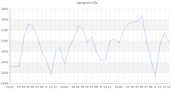 Date d'inscription : 10/01/13. Donateur pour EchecsEmail : Non ( Cliquez ici pour soutenir EchecsEmail. ) Elo non arrondi:1694.2 ( 279 sur 449 joueurs ) Nombre de victoires :2561 Nombre de nulles :297 Nombre de défaites :3434 Temps de réponse moyen par coup : 0J 4H 59M 7S ( Moyenne sur 3231 coups ). Rd ( Un petit rd indique un elo fiable ) : 54 Magic Elo:1600 Magic Rd : 350 Elo maximum atteint ( en étant classé ) :2030 Elo maximum atteint cette année :1840 Nombre coups joués : 231980 Classement coupe : 88 Points coupe : 152.78 Classement Coupe Magic Chess : Inactif Points Coupe Magic Chess : 0 Tournoi échelle : Inactif. Tournois gagnés : 05/11/2025 : Cat 2 : Victoire dans le tournoi n°27132 02/10/2025 : Cat 2 : Victoire dans le tournoi n°27081 11/06/2025 : Cat 3 : Victoire dans le tournoi n°26796 10/06/2025 : Cat 3 : Victoire dans le tournoi n°26802 09/05/2025 : Cat 3 : Victoire dans le tournoi n°26629 08/03/2025 : Cat 3 : Victoire dans le tournoi n°26537 22/02/2025 : Cat 3 : Victoire dans le tournoi n°26482 10/02/2025 : Cat 3 : Victoire dans le tournoi n°26407 07/02/2025 : Cat 3 : Victoire dans le tournoi n°26424 22/12/2024 : Cat 3 : Victoire dans le tournoi n°26322 11/12/2024 : Cat 2 : Victoire dans le tournoi n°26267 04/12/2024 : Cat 3 : Victoire dans le tournoi n°26238 28/11/2024 : Cat 3 : Victoire dans le tournoi n°26262 26/11/2024 : Cat 3 : Victoire dans le tournoi n°26213 26/08/2024 : Cat 2 : Victoire dans le tournoi n°25930 12/08/2024 : Cat 2 : Victoire dans le tournoi n°25946 10/07/2024 : Cat 3 : Victoire dans le tournoi n°25844 24/05/2024 : Cat 3 : Victoire dans le tournoi n°25816 13/05/2024 : Cat 3 : Victoire dans le tournoi n°25776 26/04/2024 : Cat 3 : Victoire dans le tournoi n°25764 09/04/2024 : Cat 2 : Victoire dans le tournoi n°25691 06/04/2024 : Cat 3 : Victoire dans le tournoi n°25681 28/03/2024 : Cat 2 : Victoire dans le tournoi n°25698 17/03/2024 : Cat 2 : Victoire dans le tournoi n°25603 15/03/2024 : Cat 2 : Victoire dans le tournoi n°25639 23/02/2024 : Cat 2 : Victoire dans le tournoi n°25596 15/02/2024 : Cat 2 : Victoire dans le tournoi n°25577 07/02/2024 : Cat 2 : Victoire dans le tournoi n°25572 07/02/2024 : Cat 2 : Victoire dans le tournoi n°25583 31/01/2024 : Cat 2 : Victoire dans le tournoi n°25563 30/01/2024 : Cat 2 : Victoire dans le tournoi n°25541 28/01/2024 : Cat 2 : Victoire dans le tournoi n°25550 04/01/2024 : Cat 2 : Victoire dans le tournoi n°25444 15/12/2023 : Cat 2 : Victoire dans le tournoi n°25427 04/12/2023 : Cat 2 : Victoire dans le tournoi n°25327 03/12/2023 : Cat 2 : Victoire dans le tournoi n°25386 22/11/2023 : Cat 2 : Victoire dans le tournoi n°25354 20/11/2023 : Cat 2 : Victoire dans le tournoi n°25341 05/06/2023 : Cat 3 : Victoire dans le tournoi n°24943 29/05/2023 : Cat 3 : Victoire dans le tournoi n°24879 22/05/2023 : Cat 3 : Victoire dans le tournoi n°24870 07/05/2023 : Cat 3 : Victoire dans le tournoi n°24845 28/04/2023 : Cat 2 : Victoire dans le tournoi n°24847 22/04/2023 : Cat 2 : Victoire dans le tournoi n°24832 11/08/2021 : Cat 2 : Victoire dans le tournoi n°22978 01/08/2021 : Cat 3 : Victoire dans le tournoi n°22997 26/07/2021 : Cat 2 : Victoire dans le tournoi n°22958 20/07/2021 : Cat 2 : Victoire dans le tournoi n°22932 13/07/2021 : Cat 2 : Victoire dans le tournoi n°22900 22/02/2021 : Cat 3 : Victoire dans le tournoi n°22398 20/02/2021 : Cat 3 : Victoire dans le tournoi n°22368 08/02/2021 : Cat 3 : Victoire dans le tournoi n°22376 26/11/2020 : Cat 3 : Victoire dans le tournoi n°22018 18/09/2019 : Cat 3 : Victoire dans le tournoi n°20075 04/09/2019 : Cat 3 : Victoire dans le tournoi n°20051 16/08/2019 : Cat 3 : Victoire dans le tournoi n°19963 16/01/2019 : Cat 3 : Victoire dans le tournoi n°19038 14/12/2018 : Cat 3 : Victoire dans le tournoi n°19040 19/11/2018 : Cat 3 : Victoire dans le tournoi n°19005 19/11/2018 : Cat 3 : Victoire dans le tournoi n°18983 16/11/2018 : Cat 3 : Victoire dans le tournoi n°18905 10/11/2018 : Cat 3 : Victoire dans le tournoi n°18939 16/10/2018 : Cat 3 : Victoire dans le tournoi n°18729 08/10/2018 : Cat 3 : Victoire dans le tournoi n°18725 06/10/2018 : Cat 2 : Victoire dans le tournoi n°18718 03/10/2018 : Cat 3 : Victoire dans le tournoi n°18720 24/09/2018 : Cat 3 : Victoire dans le tournoi n°18575 28/06/2018 : Cat 3 : Victoire dans le tournoi n°18297 23/06/2018 : Cat 3 : Victoire dans le tournoi n°18212 16/06/2018 : Cat 3 : Victoire dans le tournoi n°18241 12/06/2018 : Cat 3 : Victoire dans le tournoi n°18160 29/04/2018 : Cat 3 : Victoire dans le tournoi n°17689 14/03/2018 : Cat 3 : Victoire dans le tournoi n°17787 10/02/2018 : Cat 3 : Victoire dans le tournoi n°17692 26/10/2017 : Cat 3 : Victoire dans le tournoi n°17149 09/09/2017 : Cat 3 : Victoire dans le tournoi n°17010 28/07/2017 : Cat 3 : Victoire dans le tournoi n°16740 07/06/2017 : Cat 3 : Victoire dans le tournoi n°16464 19/05/2017 : Cat 3 : Victoire dans le tournoi n°16261 25/03/2017 : Cat 3 : Victoire dans le tournoi n°16303 22/03/2017 : Cat 3 : Victoire dans le tournoi n°16252 18/01/2017 : Cat 3 : Victoire dans le tournoi n°15890 19/10/2016 : Cat 3 : Victoire dans le tournoi n°15327 03/07/2016 : Cat 3 : Victoire dans le tournoi n°14879 10/04/2016 : Cat 3 : Victoire dans le tournoi n°14364 22/02/2016 : Cat 3 : Victoire dans le tournoi n°14347 01/02/2016 : Cat 3 : Victoire dans le tournoi n°18965 21/12/2015 : Cat 3 : Victoire dans le tournoi n°18678 25/11/2015 : Cat 3 : Victoire dans le tournoi n°18522 06/05/2015 : Cat 3 : Victoire dans le tournoi n°17320 01/05/2015 : Cat 3 : Victoire dans le tournoi n°17351 28/04/2015 : Cat 3 : Victoire dans le tournoi n°17174 03/03/2015 : Cat 3 : Victoire dans le tournoi n°17209 16/02/2015 : Cat 3 : Victoire dans le tournoi n°17084 19/08/2014 : Cat 4 : Victoire dans le tournoi n°15803 31/07/2014 : Cat 3 : Victoire dans le tournoi n°15484 25/07/2014 : Cat 3 : Victoire dans le tournoi n°15504 24/07/2014 