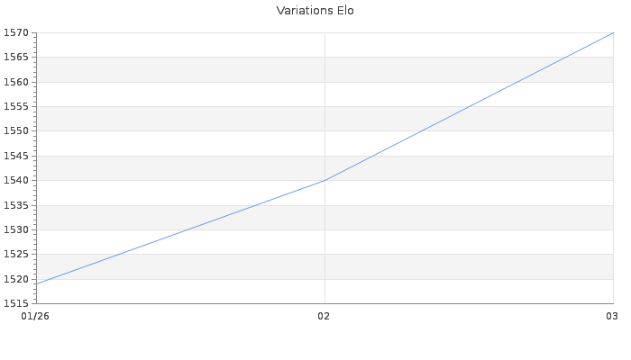 Date d'inscription : 08/01/26. Donateur pour EchecsEmail : Non ( Cliquez ici pour soutenir EchecsEmail. ) Elo non arrondi:1569.7 ( 329 sur 441 joueurs ) Nombre de victoires :6 Nombre de nulles :1 Nombre de défaites :2 Temps de réponse moyen par coup : 0J 8H 54M 48S ( Moyenne sur 353 coups ). Rd ( Un petit rd indique un elo fiable ) : 126 Elo maximum atteint ( en étant classé ) :1630 Elo maximum atteint cette année :1630 Nombre coups joués : 508 Inscrit dans l' équipe:Les enfants de l Atlantide Classement coupe : Inactif Points coupe : 0 Classement Coupe Magic Chess : Inactif Points Coupe Magic Chess : 0 Tournoi échelle : Nombre de tournois gagnés :0