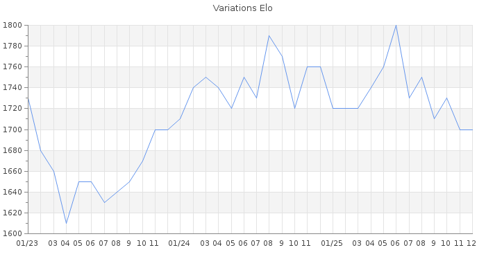 Date d'inscription : 26/04/08. Donateur pour EchecsEmail : Non ( Cliquez ici pour soutenir EchecsEmail. ) Elo non arrondi:1700.3 ( 279 sur 452 joueurs ) Nombre de victoires :238 Nombre de nulles :13 Nombre de défaites :203 Temps de réponse moyen par coup : 0J 12H 39M 50S ( Moyenne sur 177 coups ). Rd ( Un petit rd indique un elo fiable ) : 83 Magic Elo:1600 Magic Rd : 350 Elo maximum atteint ( en étant classé ) :1850 Elo maximum atteint cette année :1800 Nombre coups joués : 16568 Classement coupe : Inactif Points coupe : 0 Classement Coupe Magic Chess : Inactif Points Coupe Magic Chess : 0 Tournoi échelle : Nombre de tournois gagnés :0