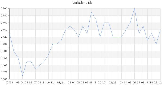 Date d'inscription : 26/04/08. Donateur pour EchecsEmail : Non ( Cliquez ici pour soutenir EchecsEmail. ) Elo non arrondi:1744 ( 264 sur 458 joueurs ) Nombre de victoires :240 Nombre de nulles :13 Nombre de défaites :203 Temps de réponse moyen par coup : 0J 13H 39M 23S ( Moyenne sur 182 coups ). Rd ( Un petit rd indique un elo fiable ) : 84 Magic Elo:1600 Magic Rd : 350 Elo maximum atteint ( en étant classé ) :1850 Elo maximum atteint cette année :1800 Nombre coups joués : 16591 Classement coupe : Inactif Points coupe : 0 Classement Coupe Magic Chess : Inactif Points Coupe Magic Chess : 0 Tournoi échelle : Nombre de tournois gagnés :0