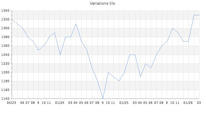 Date d'inscription : 16/04/07. Donateur pour EchecsEmail : Non ( Cliquez ici pour soutenir EchecsEmail. ) Elo non arrondi:1328.7 ( 404 sur 442 joueurs ) Nombre de victoires :1729 Nombre de nulles :115 Nombre de défaites :2170 Temps de réponse moyen par coup : 0J 15H 50M 57S ( Moyenne sur 948 coups ). Rd ( Un petit rd indique un elo fiable ) : 61 Magic Elo:1600 Magic Rd : 350 Elo maximum atteint ( en étant classé ) :1610 Elo maximum atteint cette année :1330 Nombre coups joués : 135424 Classement coupe : Inactif Points coupe : 0 Classement Coupe Magic Chess : Inactif Points Coupe Magic Chess : 0 Tournoi échelle : Nombre de tournois gagnés :0