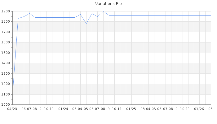 Date d'inscription : 28/04/23. Donateur pour EchecsEmail : Non ( Cliquez ici pour soutenir EchecsEmail. ) Elo non arrondi:1829.1 ( 223 sur 441 joueurs ) Nombre de victoires :42 Nombre de nulles :9 Nombre de défaites :50 Temps de réponse moyen par coup : 0J 6H 41M 53S ( Moyenne sur 0 coups ). Rd ( Un petit rd indique un elo fiable ) : 65 Elo maximum atteint ( en étant classé ) :1910 Elo maximum atteint cette année :0 Nombre coups joués : 3400 Classement coupe : Inactif Points coupe : 0 Classement Coupe Magic Chess : Inactif Points Coupe Magic Chess : 0 Tournoi échelle : Tournois gagnés : 07/07/2024 : Cat 3 : Victoire dans le tournoi n°25898 14/06/2024 : Cat 4 : Victoire dans le tournoi n°25804 10/06/2024 : Cat 3 : Victoire dans le tournoi n°25872 17/06/2023 : Cat 3 : Victoire dans le tournoi n°24968 04/06/2023 : Cat 3 : Victoire dans le tournoi n°24954 02/06/2023 : Cat 2 : Victoire dans le tournoi n°24949 Nombre de tournois gagnés :6