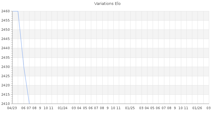 Date d'inscription : 01/06/20. Donateur pour EchecsEmail : Non ( Cliquez ici pour soutenir EchecsEmail. ) Elo non arrondi:2369.5 ( 30 sur 441 joueurs ) Nombre de victoires :127 Nombre de nulles :20 Nombre de défaites :58 Temps de réponse moyen par coup : 1J 7H 8M 46S ( Moyenne sur 0 coups ). Rd ( Un petit rd indique un elo fiable ) : 81 Magic Elo:1700 Magic Rd : 350 Elo maximum atteint ( en étant classé ) :2490 Elo maximum atteint cette année :0 Nombre coups joués : 6275 Classement coupe : Inactif Points coupe : 19.23 Classement Coupe Magic Chess : Inactif Points Coupe Magic Chess : 0 Tournoi échelle : Inactif. Tournois gagnés : 28/07/2020 : Cat 5 : Victoire dans le tournoi n°21414 30/06/2020 : Cat 4 : Victoire dans le tournoi n°21436 10/06/2020 : Cat 2 : Victoire dans le tournoi n°21373 Nombre de tournois gagnés :3
