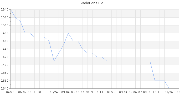 Date d'inscription : 22/12/18. Donateur pour EchecsEmail : Non ( Cliquez ici pour soutenir EchecsEmail. ) Elo non arrondi:1329.7 ( 417 sur 442 joueurs ) Nombre de victoires :22 Nombre de nulles :13 Nombre de défaites :123 Temps de réponse moyen par coup : 0J 2H 26M 14S ( Moyenne sur 87 coups ). Rd ( Un petit rd indique un elo fiable ) : 128 Elo maximum atteint ( en étant classé ) :1540 Elo maximum atteint cette année :1360 Nombre coups joués : 6166 Classement coupe : Inactif Points coupe : 0 Classement Coupe Magic Chess : Inactif Points Coupe Magic Chess : 0 Tournoi échelle : Nombre de tournois gagnés :0