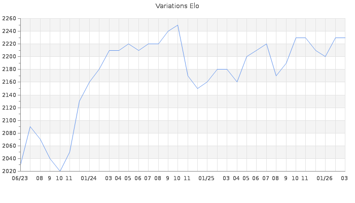 Date d'inscription : 04/06/23. Donateur pour EchecsEmail : Non ( Cliquez ici pour soutenir EchecsEmail. ) Elo non arrondi:2223 ( 54 sur 441 joueurs ) Nombre de victoires :66 Nombre de nulles :20 Nombre de défaites :28 Temps de réponse moyen par coup : 0J 16H 13M 1S ( Moyenne sur 67 coups ). Rd ( Un petit rd indique un elo fiable ) : 97 Magic Elo:1700 Magic Rd : 350 Elo maximum atteint ( en étant classé ) :2280 Elo maximum atteint cette année :2230 Nombre coups joués : 2979 Classement coupe : Inactif Points coupe : 0 Classement Coupe Magic Chess : Inactif Points Coupe Magic Chess : 0 Tournoi échelle : Inactif. Tournois gagnés : 08/10/2024 : Cat 5 : Victoire dans le tournoi n°25948 08/06/2024 : Cat 5 : Victoire dans le tournoi n°25826 12/03/2024 : Cat 5 : Victoire dans le tournoi n°25626 27/01/2024 : Cat 5 : Victoire dans le tournoi n°25520 20/12/2023 : Cat 4 : Victoire dans le tournoi n°25339 14/10/2023 : Cat 4 : Victoire dans le tournoi n°25224 13/09/2023 : Cat 4 : Victoire dans le tournoi n°25168 31/07/2023 : Cat 4 : Victoire dans le tournoi n°25044 28/06/2023 : Cat 3 : Victoire dans le tournoi n°25016 22/06/2023 : Cat 2 : Victoire dans le tournoi n°24975 Nombre de tournois gagnés :10
