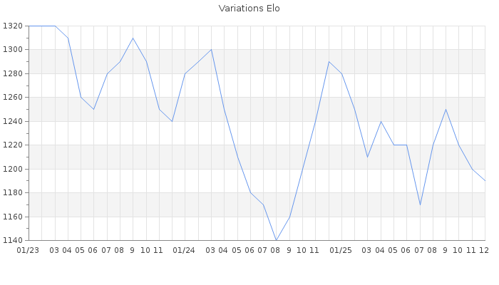 Date d'inscription : 17/11/07. Donateur pour EchecsEmail : Non ( Cliquez ici pour soutenir EchecsEmail. ) Elo non arrondi:1192 ( 441 sur 454 joueurs ) Nombre de victoires :805 Nombre de nulles :20 Nombre de défaites :1138 Temps de réponse moyen par coup : 0J 15H 25M 40S ( Moyenne sur 248 coups ). Rd ( Un petit rd indique un elo fiable ) : 84 Magic Elo:1600 Magic Rd : 350 Elo maximum atteint ( en étant classé ) :1540 Elo maximum atteint cette année :1290 Nombre coups joués : 69185 Classement coupe : Inactif Points coupe : 0 Classement Coupe Magic Chess : Inactif Points Coupe Magic Chess : 0 Tournoi échelle : Nombre de tournois gagnés :0