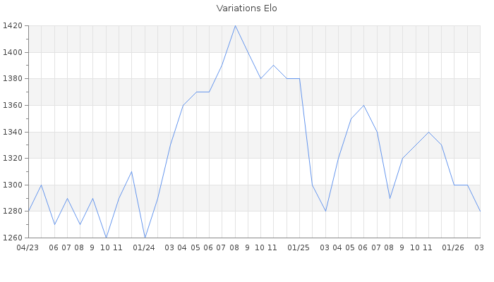 Date d'inscription : 05/10/13. Donateur pour EchecsEmail : Non ( Cliquez ici pour soutenir EchecsEmail. ) Elo non arrondi:1281.5 ( 415 sur 442 joueurs ) Nombre de victoires :329 Nombre de nulles :18 Nombre de défaites :500 Temps de réponse moyen par coup : 0J 6H 14M 24S ( Moyenne sur 602 coups ). Rd ( Un petit rd indique un elo fiable ) : 68 Magic Elo:1700 Magic Rd : 350 Elo maximum atteint ( en étant classé ) :1420 Elo maximum atteint cette année :1330 Nombre coups joués : 30480 Inscrit dans l' équipe:Sol Seppy Classement coupe : Inactif Points coupe : 0 Classement Coupe Magic Chess : Inactif Points Coupe Magic Chess : 0 Tournoi échelle : Inactif. Tournois gagnés : 12/05/2025 : Cat 0 : Victoire dans le tournoi n°26618 27/11/2019 : Cat 0 : Victoire dans le tournoi n°20119 Nombre de tournois gagnés :2