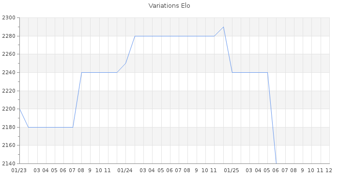 Date d'inscription : 02/05/20. Donateur pour EchecsEmail : Non ( Cliquez ici pour soutenir EchecsEmail. ) Elo non arrondi:2126 ( 91 sur 456 joueurs ) Nombre de victoires :39 Nombre de nulles :5 Nombre de défaites :24 Temps de réponse moyen par coup : 0J 6H 7M 36S ( Moyenne sur 8 coups ). Rd ( Un petit rd indique un elo fiable ) : 115 Elo maximum atteint ( en étant classé ) :2290 Elo maximum atteint cette année :2240 Nombre coups joués : 2157 Classement coupe : Inactif, date de la dernière qualification : 03/02/24 Points coupe : 46.07 Classement Coupe Magic Chess : Inactif Points Coupe Magic Chess : 0 Tournoi échelle : Tournois gagnés : 26/01/2023 : Cat 5 : Victoire dans le tournoi n°24519 21/10/2020 : Cat 4 : Victoire dans le tournoi n°21730 11/06/2020 : Cat 4 : Victoire dans le tournoi n°21322 25/05/2020 : Cat 3 : Victoire dans le tournoi n°21299 Nombre de tournois gagnés :4
