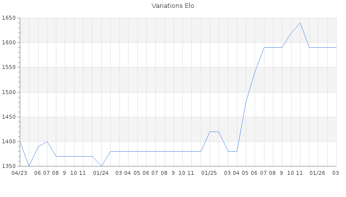 Date d'inscription : 23/11/20. Donateur pour EchecsEmail : Non ( Cliquez ici pour soutenir EchecsEmail. ) Elo non arrondi:1583.7 ( 336 sur 441 joueurs ) Nombre de victoires :35 Nombre de nulles :3 Nombre de défaites :31 Temps de réponse moyen par coup : 0J 10H 31M 31S ( Moyenne sur 54 coups ). Rd ( Un petit rd indique un elo fiable ) : 87 Elo maximum atteint ( en étant classé ) :1640 Elo maximum atteint cette année :0 Nombre coups joués : 2411 Classement coupe : Inactif Points coupe : 0 Classement Coupe Magic Chess : Inactif Points Coupe Magic Chess : 0 Tournoi échelle : Tournois gagnés : 18/07/2025 : Cat 1 : Victoire dans le tournoi n°26812 25/10/2021 : Cat 1 : Victoire dans le tournoi n°23189 06/04/2021 : Cat 0 : Victoire dans le tournoi n°22319 Nombre de tournois gagnés :3