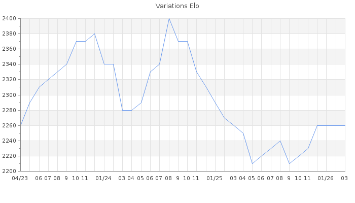 Date d'inscription : 31/03/06. Donateur pour EchecsEmail : Non ( Cliquez ici pour soutenir EchecsEmail. ) Elo non arrondi:2256.5 ( 51 sur 442 joueurs ) Nombre de victoires :174 Nombre de nulles :42 Nombre de défaites :126 Temps de réponse moyen par coup : 0J 7H 32M 45S ( Moyenne sur 116 coups ). Rd ( Un petit rd indique un elo fiable ) : 90 Elo maximum atteint ( en étant classé ) :2510 Elo maximum atteint cette année :2260 Nombre coups joués : 10045 Classement coupe : Inactif Points coupe : 0 Classement Coupe Magic Chess : Inactif Points Coupe Magic Chess : 0 Tournoi échelle : Tournois gagnés : 22/07/2025 : Cat 5 : Victoire dans le tournoi n°26787 13/07/2024 : Cat 5 : Victoire dans le tournoi n°25817 07/08/2023 : Cat 5 : Victoire dans le tournoi n°24965 25/05/2023 : Cat 5 : Victoire dans le tournoi n°24769 21/11/2022 : Cat 6 : Victoire dans le tournoi n°24355 15/09/2021 : Cat 5 : Victoire dans le tournoi n°23054 03/05/2020 : Cat 5 : Victoire dans le tournoi n°21063 26/03/2018 : Cat 5 : Victoire dans le tournoi n°17542 12/09/2016 : Cat 5 : Victoire dans le tournoi n°15294 23/10/2014 : Cat 6 : Victoire dans le tournoi n°15578 27/02/2014 : Cat 6 : Victoire dans le tournoi n°14463 12/12/2012 : Cat 6 : Victoire dans le tournoi n°10976 16/09/2010 : Cat 5 : Victoire dans le tournoi n°7627 17/08/2010 : Cat 5 : Victoire dans le tournoi n°7558 25/05/2010 : Cat 4 : Victoire dans le tournoi n°7239 24/06/2008 : Cat 4 : Victoire dans le tournoi n°4943 Nombre de tournois gagnés :16