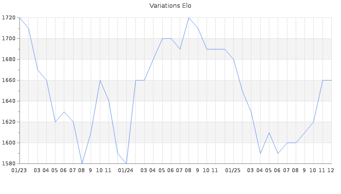 Date d'inscription : 15/04/08. Donateur pour EchecsEmail : Non ( Cliquez ici pour soutenir EchecsEmail. ) Elo non arrondi:1662.2 ( 294 sur 450 joueurs ) Nombre de victoires :1759 Nombre de nulles :197 Nombre de défaites :1586 Temps de réponse moyen par coup : 0J 19H 48M 33S ( Moyenne sur 495 coups ). Rd ( Un petit rd indique un elo fiable ) : 70 Magic Elo:1355.45 Magic Rd : 212 Elo maximum atteint ( en étant classé ) :1870 Elo maximum atteint cette année :1700 Nombre coups joués : 126837 Inscrit dans l' équipe:La Diagonale du Fou Classement coupe : Inactif Points coupe : 0 Classement Coupe Magic Chess : Inactif Points Coupe Magic Chess : 0 Tournoi échelle : Inactif. Tournois gagnés : 03/06/2024 : Cat 2 : Premier au tournoi multi Saint-Valentin 2024 n°1 21/04/2024 : Cat 2 : Premier au tournoi multi Saint-Valentin 2024 n°4 23/03/2022 : Cat 2 : Premier au tournoi multi Saint-Valentin 2022 n°2 17/03/2022 : Cat 1 : Premier au tournoi multi Noël 2021 n°3 16/11/2021 : Cat 1 : Premier au tournoi multi Halloween 2021 n°3 06/03/2021 : Cat 2 : Premier au tournoi multi Saint-Valentin 2021 n°4 11/12/2020 : Cat 2 : Premier au tournoi multi Halloween 2020 n°2 13/08/2020 : Cat 2 : Victoire dans le tournoi n°21458 30/09/2018 : Cat 2 : Victoire dans le tournoi n°18188 02/09/2018 : Cat 2 : Victoire dans le tournoi n°18144 09/05/2018 : Cat 0 : Premier au tournoi multi Noël 2017 n°1 24/01/2018 : Cat 0 : Premier au tournoi multi Noël 2017 n°2 13/12/2017 : Cat 0 : Premier au tournoi multi Automne 2017 n°1 02/12/2017 : Cat 2 : Victoire dans le tournoi n°17235 27/11/2017 : Cat 2 : Victoire dans le tournoi n°16983 26/10/2017 : Cat 0 : Premier au tournoi multi Automne 2017 n°3 02/07/2017 : Cat 2 : Premier au tournoi multi Printemps 2017 n°5 08/04/2017 : Cat 2 : Victoire dans le tournoi n°16110 28/01/2017 : Cat 2 : Victoire dans le tournoi n°15695 22/01/2017 : Cat 0 : Premier au tournoi multi Halloween 2016 n°4 11/01/2017 : Cat 1 : Victoire dans le tournoi n°15125 04/03/2016 : Cat 2 : Victoire dans le tournoi n°14309 11/01/2016 : Cat 2 : Victoire dans le tournoi n°18999 25/11/2015 : Cat 2 : Victoire dans le tournoi n°18418 05/10/2015 : Cat 2 : Victoire dans le tournoi n°18337 18/03/2014 : Cat 1 : Victoire dans le tournoi n°14327 30/06/2013 : Cat 2 : Victoire dans le tournoi n°12247 24/04/2013 : Cat 2 : Victoire dans le tournoi n°12080 09/02/2012 : Cat 2 : Victoire dans le tournoi n°9687 04/12/2011 : Cat 2 : Victoire dans le tournoi n°9294 21/11/2011 : Cat 2 : Victoire dans le tournoi n°9275 14/11/2011 : Cat 2 : Victoire dans le tournoi n°9399 08/11/2011 : Cat 3 : Victoire dans le tournoi n°9068 21/09/2011 : Cat 2 : Victoire dans le tournoi n°8846 15/07/2011 : Cat 3 : Victoire dans le tournoi n°8835 27/06/2011 : Cat 2 : Victoire dans le tournoi n°8642 09/06/2011 : Cat 2 : Victoire dans le tournoi n°8614 02/06/2011 : Cat 2 : Victoire dans le tournoi n°8627 14/04/2011 : Cat 2 : Victoire dans le tournoi n°8496 Nombre de tournois gagnés :46
