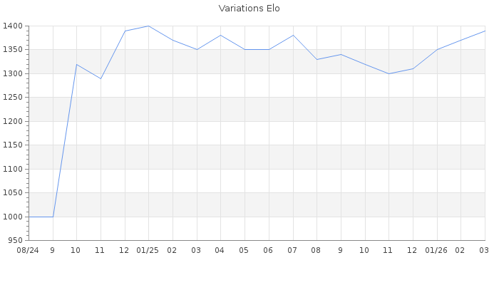 Date d'inscription : 20/08/24. Donateur pour EchecsEmail : Non ( Cliquez ici pour soutenir EchecsEmail. ) Elo non arrondi:1388.9 ( 394 sur 442 joueurs ) Nombre de victoires :28 Nombre de nulles :0 Nombre de défaites :19 Temps de réponse moyen par coup : 0J 5H 14M 31S ( Moyenne sur 301 coups ). Rd ( Un petit rd indique un elo fiable ) : 83 Elo maximum atteint ( en étant classé ) :1430 Elo maximum atteint cette année :1390 Nombre coups joués : 2349 Classement coupe : Inactif Points coupe : 0 Classement Coupe Magic Chess : Inactif Points Coupe Magic Chess : 0 Tournoi échelle : Nombre de tournois gagnés :0