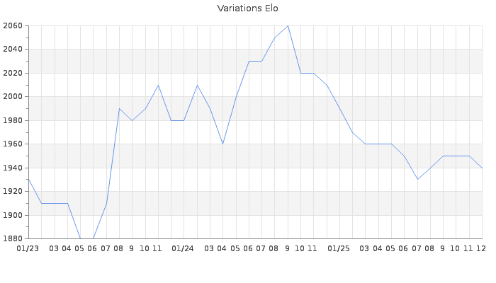 Date d'inscription : 10/08/11. Donateur pour EchecsEmail : Non ( Cliquez ici pour soutenir EchecsEmail. ) Elo non arrondi:1943.5 ( 155 sur 454 joueurs ) Nombre de victoires :1726 Nombre de nulles :112 Nombre de défaites :365 Temps de réponse moyen par coup : 0J 0H 55M 39S ( Moyenne sur 2372 coups ). Rd ( Un petit rd indique un elo fiable ) : 95 Magic Elo:1795.27 Magic Rd : 292 Elo maximum atteint ( en étant classé ) :2130 Elo maximum atteint cette année :2010 Nombre coups joués : 89093 Classement coupe : Inactif Points coupe : 0 Classement Coupe Magic Chess : Inactif Points Coupe Magic Chess : 0 Tournoi échelle : Inactif. Nombre de tournois gagnés :0
