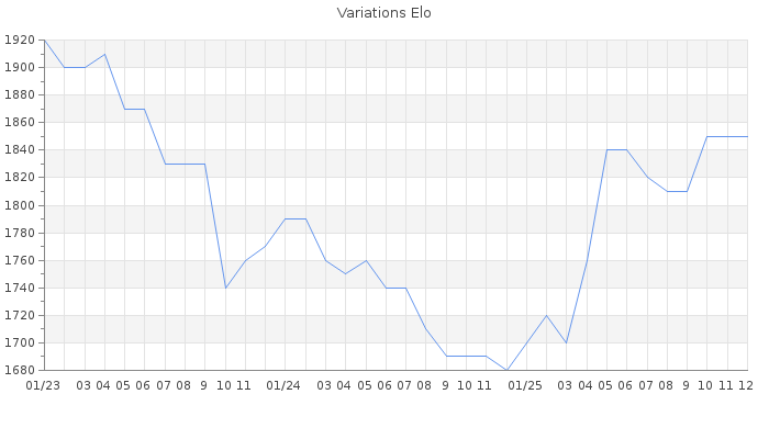 Date d'inscription : 02/08/08. Donateur pour EchecsEmail : Non ( Cliquez ici pour soutenir EchecsEmail. ) Elo non arrondi:1846 ( 206 sur 452 joueurs ) Nombre de victoires :570 Nombre de nulles :125 Nombre de défaites :276 Temps de réponse moyen par coup : 0J 19H 43M 48S ( Moyenne sur 152 coups ). Rd ( Un petit rd indique un elo fiable ) : 80 Magic Elo:1600 Magic Rd : 350 Elo maximum atteint ( en étant classé ) :2060 Elo maximum atteint cette année :1850 Nombre coups joués : 39012 Classement coupe : Inactif, date de la dernière qualification : 28/09/22 Points coupe : 0.63 Classement Coupe Magic Chess : Inactif Points Coupe Magic Chess : 0 Tournoi échelle : Tournois gagnés : 08/05/2025 : Cat 3 : Victoire dans le tournoi n°26603 03/02/2023 : Cat 4 : Victoire dans le tournoi n°24296 28/09/2022 : Cat 3 : Victoire dans le tournoi n°24238 16/02/2022 : Cat 4 : Victoire dans le tournoi n°23597 19/01/2022 : Cat 3 : Victoire dans le tournoi n°23249 26/02/2021 : Cat 3 : Victoire dans le tournoi n°22205 13/11/2020 : Cat 3 : Victoire dans le tournoi n°21611 22/11/2019 : Cat 4 : Victoire dans le tournoi n°20276 25/10/2019 : Cat 4 : Victoire dans le tournoi n°20221 24/09/2019 : Cat 4 : Victoire dans le tournoi n°20010 11/04/2019 : Cat 4 : Victoire dans le tournoi n°19362 09/03/2019 : Cat 4 : Victoire dans le tournoi n°19284 09/02/2019 : Cat 4 : Victoire dans le tournoi n°19101 01/09/2018 : Cat 4 : Victoire dans le tournoi n°18314 29/08/2018 : Cat 4 : Victoire dans le tournoi n°18447 09/05/2018 : Cat 4 : Victoire dans le tournoi n°18078 22/04/2018 : Cat 4 : Victoire dans le tournoi n°17937 15/09/2017 : Cat 4 : Victoire dans le tournoi n°16472 22/01/2017 : Cat 4 : Victoire dans le tournoi n°15842 25/08/2016 : Cat 3 : Victoire dans le tournoi n°14968 31/05/2016 : Cat 3 : Victoire dans le tournoi n°14800 29/04/2016 : Cat 3 : Victoire dans le tournoi n°14291 28/11/2015 : Cat 4 : Victoire dans le tournoi n°18533 21/10/2015 : Cat 3 : Victoire dans le tournoi n°18480 26/01/2015 : Cat 3 : Victoire dans le tournoi n°16736 29/11/2014 : Cat 4 : Victoire dans le tournoi n°15763 20/07/2014 : Cat 3 : Victoire dans le tournoi n°15521 Nombre de tournois gagnés :27