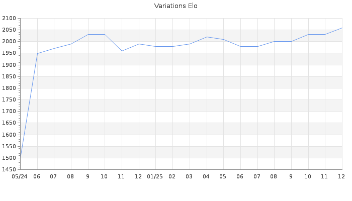 Date d'inscription : 23/05/24. Donateur pour EchecsEmail : Non ( Cliquez ici pour soutenir EchecsEmail. ) Elo non arrondi:2064.3 ( 101 sur 452 joueurs ) Nombre de victoires :28 Nombre de nulles :6 Nombre de défaites :9 Temps de réponse moyen par coup : 1J 4H 35M 33S ( Moyenne sur 76 coups ). Rd ( Un petit rd indique un elo fiable ) : 103 Elo maximum atteint ( en étant classé ) :2060 Elo maximum atteint cette année :2060 Nombre coups joués : 1563 Classement coupe : 130 Points coupe : 23.65 Classement Coupe Magic Chess : Inactif Points Coupe Magic Chess : 0 Tournoi échelle : Inactif. Tournois gagnés : 09/12/2025 : Cat 4 : Victoire dans le tournoi n°26978 13/05/2025 : Cat 4 : Victoire dans le tournoi n°26680 05/04/2025 : Cat 4 : Victoire dans le tournoi n°26605 15/07/2024 : Cat 3 : Victoire dans le tournoi n°25904 24/06/2024 : Cat 2 : Victoire dans le tournoi n°25835 Nombre de tournois gagnés :5