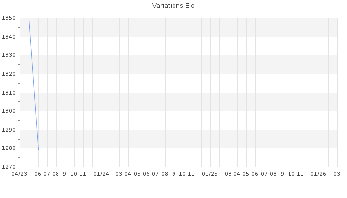 Date d'inscription : 01/11/22. Donateur pour EchecsEmail : Non ( Cliquez ici pour soutenir EchecsEmail. ) Elo non arrondi:1235.3 ( 496 sur 441 joueurs ) Nombre de victoires :0 Nombre de nulles :0 Nombre de défaites :6 Temps de réponse moyen par coup : 1J 16H 32M 56S ( Moyenne sur 0 coups ). Rd ( Un petit rd indique un elo fiable ) : 178 Elo maximum atteint ( en étant classé ) :0 Elo maximum atteint cette année :0 Nombre coups joués : 40 Classement coupe : Inactif Points coupe : 0 Classement Coupe Magic Chess : Inactif Points Coupe Magic Chess : 0 Tournoi échelle : Nombre de tournois gagnés :0