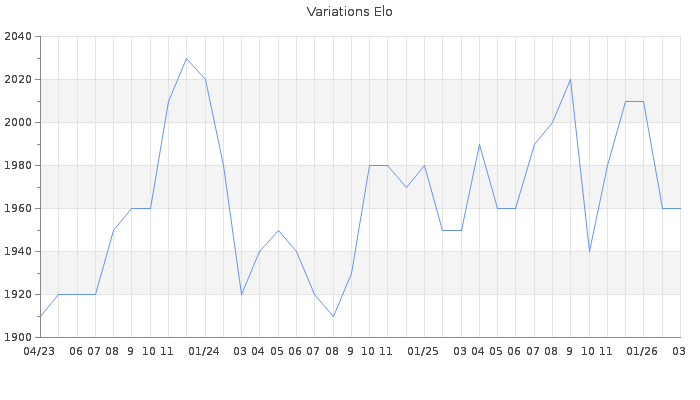 Date d'inscription : 28/09/15. Donateur pour EchecsEmail : Non ( Cliquez ici pour soutenir EchecsEmail. ) Elo non arrondi:1958.2 ( 143 sur 441 joueurs ) Nombre de victoires :469 Nombre de nulles :106 Nombre de défaites :311 Temps de réponse moyen par coup : 0J 4H 40M 47S ( Moyenne sur 461 coups ). Rd ( Un petit rd indique un elo fiable ) : 64 Elo maximum atteint ( en étant classé ) :2070 Elo maximum atteint cette année :2020 Nombre coups joués : 34404 Classement coupe : Inactif Points coupe : 0.36 Classement Coupe Magic Chess : Inactif Points Coupe Magic Chess : 0 Tournoi échelle : Inactif. Tournois gagnés : 16/01/2026 : Cat 4 : Victoire dans le tournoi n°27340 22/12/2025 : Cat 4 : Victoire dans le tournoi n°27294 14/12/2025 : Cat 4 : Victoire dans le tournoi n°27246 17/09/2025 : Cat 4 : Victoire dans le tournoi n°27015 14/04/2025 : Cat 4 : Victoire dans le tournoi n°26610 21/01/2025 : Cat 4 : Victoire dans le tournoi n°26411 03/02/2024 : Cat 4 : Victoire dans le tournoi n°25347 26/11/2023 : Cat 4 : Victoire dans le tournoi n°25329 13/10/2023 : Cat 4 : Victoire dans le tournoi n°25153 04/06/2023 : Cat 4 : Victoire dans le tournoi n°24852 22/01/2023 : Cat 4 : Victoire dans le tournoi n°24562 07/01/2023 : Cat 4 : Victoire dans le tournoi n°24520 17/09/2022 : Cat 4 : Victoire dans le tournoi n°24188 23/07/2022 : Cat 4 : Victoire dans le tournoi n°24060 19/07/2022 : Cat 4 : Victoire dans le tournoi n°24094 05/06/2022 : Cat 4 : Victoire dans le tournoi n°23912 21/04/2022 : Cat 4 : Victoire dans le tournoi n°23798 02/02/2022 : Cat 4 : Victoire dans le tournoi n°23609 07/01/2022 : Cat 4 : Victoire dans le tournoi n°23482 31/12/2021 : Cat 4 : Victoire dans le tournoi n°23424 11/12/2021 : Cat 4 : Victoire dans le tournoi n°23359 08/12/2021 : Cat 4 : Victoire dans le tournoi n°23379 14/11/2021 : Cat 4 : Victoire dans le tournoi n°23315 06/11/2021 : Cat 4 : Victoire dans le tournoi n°23287 27/10/2021 : Cat 4 : Victoire dans le tournoi n°23247 31/08/2021 : Cat 4 : Victoire dans le tournoi n°23086 22/08/2021 : Cat 4 : Victoire dans le tournoi n°23003 26/04/2021 : Cat 4 : Victoire dans le tournoi n°22644 19/02/2021 : Cat 4 : Victoire dans le tournoi n°22415 04/02/2021 : Cat 4 : Victoire dans le tournoi n°22369 01/02/2021 : Cat 4 : Victoire dans le tournoi n°22301 15/01/2021 : Cat 4 : Victoire dans le tournoi n°22201 16/12/2020 : Cat 4 : Victoire dans le tournoi n°22111 09/07/2020 : Cat 4 : Victoire dans le tournoi n°21363 03/07/2020 : Cat 4 : Victoire dans le tournoi n°21449 18/04/2020 : Cat 4 : Victoire dans le tournoi n°21057 30/03/2020 : Cat 4 : Victoire dans le tournoi n°20879 07/07/2019 : Cat 4 : Victoire dans le tournoi n°19838 20/12/2018 : Cat 4 : Victoire dans le tournoi n°19043 26/11/2018 : Cat 4 : Victoire dans le tournoi n°18913 28/10/2018 : Cat 4 : Victoire dans le tournoi n°18805 01/09/2018 : Cat 4 : Victoire dans le tournoi n°18474 09/01/2017 : Cat 4 : Victoire dans le tournoi n°15746 02/11/2016 : Cat 4 : Victoire dans le tournoi n°15560 24/08/2016 : Cat 4 : Victoire dans le tournoi n°15235 04/08/2016 : Cat 3 : Victoire dans le tournoi n°15117 04/07/2016 : Cat 3 : Victoire dans le tournoi n°15057 Nombre de tournois gagnés :47