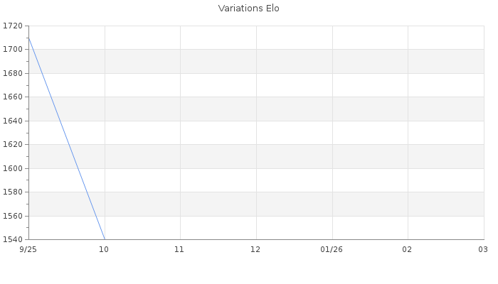 Date d'inscription : 13/09/25. Donateur pour EchecsEmail : Non ( Cliquez ici pour soutenir EchecsEmail. ) Elo non arrondi:1534 ( 360 sur 442 joueurs ) Nombre de victoires :10 Nombre de nulles :0 Nombre de défaites :21 Temps de réponse moyen par coup : 0J 18H 46M 16S ( Moyenne sur 60 coups ). Rd ( Un petit rd indique un elo fiable ) : 73 Elo maximum atteint ( en étant classé ) :1840 Elo maximum atteint cette année :0 Nombre coups joués : 727 Classement coupe : Inactif Points coupe : 0 Classement Coupe Magic Chess : Inactif Points Coupe Magic Chess : 0 Tournoi échelle : Nombre de tournois gagnés :0