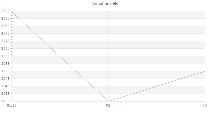Date d'inscription : 05/01/26. Donateur pour EchecsEmail : Non ( Cliquez ici pour soutenir EchecsEmail. ) Elo non arrondi:2045.3 ( 109 sur 442 joueurs ) Nombre de victoires :9 Nombre de nulles :2 Nombre de défaites :2 Temps de réponse moyen par coup : 0J 8H 35M 43S ( Moyenne sur 285 coups ). Rd ( Un petit rd indique un elo fiable ) : 121 Magic Elo:1700 Magic Rd : 350 Elo maximum atteint ( en étant classé ) :2150 Elo maximum atteint cette année :2150 Nombre coups joués : 477 Inscrit dans l' équipe:Les enfants de l Atlantide Classement coupe : Inactif Points coupe : 0 Classement Coupe Magic Chess : Inactif Points Coupe Magic Chess : 0 Tournoi échelle : Tournois gagnés : 02/02/2026 : Cat 3 : Victoire dans le tournoi n°27373 Nombre de tournois gagnés :1