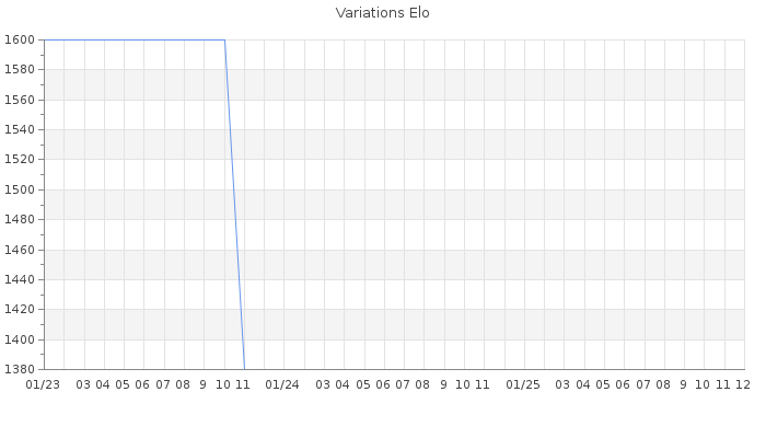 Date d'inscription : 27/10/18. Donateur pour EchecsEmail : Non ( Cliquez ici pour soutenir EchecsEmail. ) Elo non arrondi:1347.5 ( 477 sur 461 joueurs ) Nombre de victoires :14 Nombre de nulles :3 Nombre de défaites :14 Temps de réponse moyen par coup : 3J 7H 34M 34S ( Moyenne sur 0 coups ). Rd ( Un petit rd indique un elo fiable ) : 142 Magic Elo:1700 Magic Rd : 350 Elo maximum atteint ( en étant classé ) :1620 Elo maximum atteint cette année :0 Nombre coups joués : 896 Classement coupe : Inactif Points coupe : 0 Classement Coupe Magic Chess : Inactif Points Coupe Magic Chess : 0 Tournoi échelle : Tournois gagnés : 28/03/2021 : Cat 2 : Victoire dans le tournoi n°22342 22/01/2019 : Cat 0 : Victoire dans le tournoi n°18875 Nombre de tournois gagnés :2