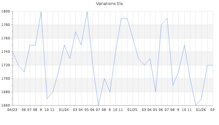 Date d'inscription : 12/02/08. Donateur pour EchecsEmail : Non ( Cliquez ici pour soutenir EchecsEmail. ) Elo non arrondi:1715.6 ( 261 sur 442 joueurs ) Nombre de victoires :14905 Nombre de nulles :3223 Nombre de défaites :14851 Temps de réponse moyen par coup : 0J 2H 34M 56S ( Moyenne sur 14293 coups ). Rd ( Un petit rd indique un elo fiable ) : 50 Magic Elo:1600 Magic Rd : 350 Elo maximum atteint ( en étant classé ) :1970 Elo maximum atteint cette année :1750 Nombre coups joués : 1136095 Inscrit dans l' équipe:LES CHATTERBOX Classement coupe : 22 Points coupe : 3190.59 Classement Coupe Magic Chess : Inactif Points Coupe Magic Chess : 0 Tournoi échelle : Division 2 : 2 Tournois gagnés : 25/02/2026 : Cat 2 : Victoire CC Fev26 Asc 06/02/2026 : Cat 2 : Victoire dans le tournoi n°27395 28/12/2025 : Cat 2 : Victoire dans le tournoi n°27321 16/12/2025 : Cat 2 : Victoire dans le tournoi n°27287 11/12/2025 : Cat 2 : Victoire dans le tournoi n°27281 20/11/2025 : Cat 3 : Victoire CC Nov25 Asc 01/11/2025 : Cat 3 : Victoire dans le tournoi n°27161 05/09/2025 : Cat 2 : Victoire dans le tournoi n°27024 01/08/2025 : Cat 2 : Victoire dans le tournoi n°26786 05/07/2025 : Cat 2 : Victoire dans le tournoi n°26803 30/06/2025 : Cat 3 : Victoire CC Juin25 Asc 08/06/2025 : Cat 2 : Victoire dans le tournoi n°26773 06/06/2025 : Cat 2 : Victoire dans le tournoi n°26804 04/06/2025 : Cat 2 : Victoire dans le tournoi n°26772 24/05/2025 : Cat 2 : Victoire dans le tournoi n°26739 20/05/2025 : Cat 2 : Premier au tournoi multi Saint-Valentin 2025 n°1 01/04/2025 : Cat 3 : Victoire dans le tournoi n°26308 21/03/2025 : Cat 3 : Victoire dans le tournoi n°26479 20/03/2025 : Cat 3 : Victoire CC Fev25 Asc 16/03/2025 : Cat 2 : Premier au tournoi multi Saint-Valentin 2025 n°2 01/03/2025 : Cat 2 : Victoire CC Jan25 Asc 24/01/2025 : Cat 3 : Victoire dans le tournoi n°26232 18/12/2024 : Cat 3 : Victoire dans le tournoi n°26286 25/11/2024 : Cat 3 : Victoire dans le tournoi n°26272 23/11/2024 : Cat 3 : Victoire dans le tournoi n°26244 19/11/2024 : Cat 2 : Victoire dans le tournoi n°26199 16/11/2024 : Cat 2 : Victoire dans le tournoi n°26210 14/11/2024 : Cat 2 : Victoire dans le tournoi n°26162 02/11/2024 : Cat 2 : Victoire dans le tournoi n°26144 25/10/2024 : Cat 2 : Victoire dans le tournoi n°26153 09/10/2024 : Cat 3 : Victoire dans le tournoi n°26093 05/09/2024 : Cat 2 : Victoire dans le tournoi n°26041 04/09/2024 : Cat 2 : Victoire dans le tournoi n°26044 27/08/2024 : Cat 2 : Victoire dans le tournoi n°26005 20/08/2024 : Cat 2 : Victoire dans le tournoi n°26001 31/07/2024 : Cat 3 : Victoire dans le tournoi n°25833 18/06/2024 : Cat 3 : Victoire dans le tournoi n°25861 10/06/2024 : Cat 3 : Victoire dans le tournoi n°25878 19/05/2024 : Cat 3 : Victoire dans le tournoi n°25830 14/05/2024 : Cat 2 : Victoire dans le tournoi n°25800 11/05/2024 : Cat 3 : Victoire dans le tournoi n°25797 08/05/2024 : Cat 3 : Victoire dans le tournoi n°25753 21/04/2024 : Cat 2 : Victoire dans le tournoi n°25702 10/04/2024 : Cat 3 : Victoire dans le tournoi n°25728 09/04/2024 : Cat 3 : Victoire dans le tournoi n°25717 23/03/2024 : Cat 2 : Victoire dans le tournoi n°25617 20/03/2024 : Cat 2 : Victoire CC Mar24 Asc 29/02/2024 : Cat 3 : Victoire dans le tournoi n°25620 27/01/2024 : Cat 2 : Victoire dans le tournoi n°25439 16/01/2024 : Cat 3 : Victoire dans le tournoi n°25503 12/01/2024 : Cat 3 : Victoire dans le tournoi n°25469 04/01/2024 : Cat 3 : Victoire dans le tournoi n°25477 24/12/2023 : Cat 2 : Victoire CC Dec23 16/12/2023 : Cat 2 : Victoire dans le tournoi n°25436 10/12/2023 : Cat 2 : Victoire dans le tournoi n°25391 01/12/2023 : Cat 2 : Victoire dans le tournoi n°25371 30/11/2023 : Cat 2 : Victoire dans le tournoi n°25047 29/11/2023 : Cat 2 : Victoire dans le tournoi n°25368 29/11/2023 : Cat 2 : Victoire CC Nov23 Asc 06/11/2023 : Cat 3 : Victoire dans le tournoi n°25246 04/11/2023 : Cat 3 : Victoire dans le tournoi n°25238 27/10/2023 : Cat 2 : Victoire dans le tournoi n°25309 11/09/2023 : Cat 2 : Victoire dans le tournoi n°25154 10/09/2023 : Cat 3 : Victoire dans le tournoi n°25191 29/08/2023 : Cat 2 : Victoire dans le tournoi n°25152 18/08/2023 : Cat 3 : Victoire dans le tournoi n°25075 27/07/2023 : Cat 3 : Victoire dans le tournoi n°24885 12/07/2023 : Cat 2 : Victoire dans le tournoi n°25045 13/06/2023 : Cat 3 : Victoire dans le tournoi n°24842 07/04/2023 : Cat 3 : Victoire dans le tournoi n°24731 30/03/2023 : Cat 3 : Victoire dans le tournoi n°24756 19/03/2023 : Cat 3 : Victoire dans le tournoi n°24734 01/02/2023 : Cat 3 : Victoire CC Dec22 Asc 30/01/2023 : Cat 3 : Victoire dans le tournoi n°24560 24/01/2023 : Cat 2 : Victoire dans le tournoi n°24480 15/01/2023 : Cat 3 : Victoire dans le tournoi n°24491 19/12/2022 : Cat 2 : Victoire dans le tournoi n°24448 15/12/2022 : Cat 2 : Victoire dans le tournoi n°24492 28/10/2022 : Cat 3 : Victoire dans le tournoi n°24282 29/09/2022 : Cat 3 : Victoire dans le tournoi n°24225 25/08/2022 : Cat 3 : Victoire dans le tournoi n°24173 12/08/2022 : Cat 3 : Victoire dans le tournoi n°24090 05/08/2022 : Cat 3 : Victoire dans le tournoi n°23767 12/07/2022 : Cat 3 : Victoire dans le tournoi n°24080 04/07/2022 : Cat 3 : Victoire dans le tournoi n°23866 01/07/2022 : Cat 3 : Victoire dans le tournoi n°23872 23/06/2022 : Cat 3 : Victoire dans le tournoi n°23970 19/06/2022 : Cat 3 : Victoire dans le tournoi n°24038 08/06/2022 : Cat 3 : Victoire dans le tournoi n°23903 07/06/2022 : Cat 3 : Victoire dans le tournoi n°23922 05/06/2022 : Cat 3 : Victoire dans le tournoi n°23944 23/05/2022 : Cat 3 : Victoire dans le tournoi n°23938 21/05/2022 : Cat 3 : Victoire dans le tournoi n°23833 16/04/2022 : Cat 3 : Victoire dans le tournoi n°23820 04/04/2022 : Cat 3 : Victoire dans le tournoi n°23740 03/04/2022 : Cat 3 : Victoire dans le tournoi n°23801 28/03/2022 : Cat 2 : Victoire dans le tournoi n°23634 18/03/2022 : Cat 2 : Victoire CC Fev22