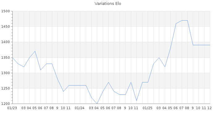 Date d'inscription : 14/07/14. Donateur pour EchecsEmail : Non ( Cliquez ici pour soutenir EchecsEmail. ) Elo non arrondi:1391.8 ( 414 sur 461 joueurs ) Nombre de victoires :152 Nombre de nulles :7 Nombre de défaites :254 Temps de réponse moyen par coup : 0J 12H 24M 36S ( Moyenne sur 62 coups ). Rd ( Un petit rd indique un elo fiable ) : 86 Magic Elo:1600 Magic Rd : 350 Elo maximum atteint ( en étant classé ) :1510 Elo maximum atteint cette année :1510 Nombre coups joués : 15782 Classement coupe : Inactif Points coupe : 0 Classement Coupe Magic Chess : Inactif Points Coupe Magic Chess : 0 Tournoi échelle : Inactif. Tournois gagnés : 04/09/2015 : Cat 0 : Victoire dans le tournoi n°18080 Nombre de tournois gagnés :1