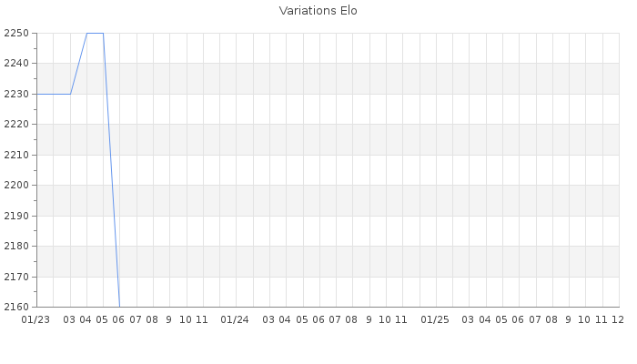 Date d'inscription : 08/11/12. Donateur pour EchecsEmail : Non ( Cliquez ici pour soutenir EchecsEmail. ) Elo non arrondi:2123.3 ( 84 sur 452 joueurs ) Nombre de victoires :213 Nombre de nulles :33 Nombre de défaites :124 Temps de réponse moyen par coup : 2J 5H 11M 58S ( Moyenne sur 0 coups ). Rd ( Un petit rd indique un elo fiable ) : 115 Magic Elo:1854.34 Magic Rd : 145 Elo maximum atteint ( en étant classé ) :2340 Elo maximum atteint cette année :0 Nombre coups joués : 11418 Classement coupe : Inactif Points coupe : 1.05 Classement Coupe Magic Chess : Inactif Points Coupe Magic Chess : 0 Tournoi échelle : Inactif. Tournois gagnés : 03/11/2020 : Cat 5 : Victoire dans le tournoi n°20914 31/08/2014 : Cat 5 : Victoire dans le tournoi n°15497 25/02/2013 : Cat 5 : Victoire dans le tournoi n°11325 13/12/2012 : Cat 4 : Victoire dans le tournoi n°11234 29/11/2012 : Cat 4 : Victoire dans le tournoi n°11210 29/11/2012 : Cat 2 : Victoire dans le tournoi n°11174 22/11/2012 : Cat 2 : Victoire dans le tournoi n°11165 Nombre de tournois gagnés :7