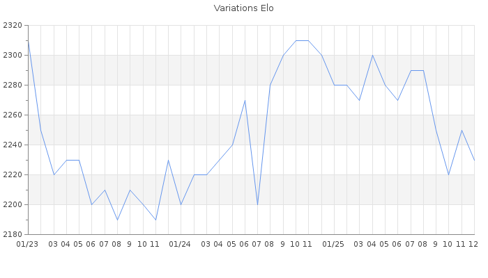 Date d'inscription : Avant le 20/12/05. Donateur pour EchecsEmail : Oui ( Cliquez ici pour soutenir EchecsEmail. ) Elo non arrondi:2230.9 ( 53 sur 450 joueurs ) Nombre de victoires :276 Nombre de nulles :58 Nombre de défaites :195 Temps de réponse moyen par coup : 0J 15H 43M 14S ( Moyenne sur 160 coups ). Rd ( Un petit rd indique un elo fiable ) : 96 Magic Elo:1774.26 Magic Rd : 80 Elo maximum atteint ( en étant classé ) :2450 Elo maximum atteint cette année :2300 Nombre coups joués : 20142 Inscrit dans l' équipe:Mission Impossible Classement coupe : 40 Points coupe : 868.34 Classement Coupe Magic Chess : Inactif Points Coupe Magic Chess : 0 Tournoi échelle : Inactif. Tournois gagnés : 24/12/2024 : Cat 4 : Premier au tournoi multi Halloween 2024 n°4 30/10/2024 : Cat 3 : Victoire CC Oct24 30/08/2018 : Cat 4 : Victoire dans le tournoi n°18505 11/03/2006 : Cat 2 : Victoire dans le tournoi n°2204 17/12/2004 : Cat 1 : Victoire dans le tournoi n°1053 Nombre de tournois gagnés :6