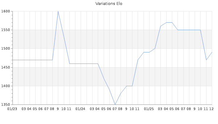 Date d'inscription : 17/10/20. Donateur pour EchecsEmail : Non ( Cliquez ici pour soutenir EchecsEmail. ) Elo non arrondi:1489.2 ( 376 sur 449 joueurs ) Nombre de victoires :54 Nombre de nulles :2 Nombre de défaites :52 Temps de réponse moyen par coup : 0J 7H 22M 34S ( Moyenne sur 437 coups ). Rd ( Un petit rd indique un elo fiable ) : 71 Magic Elo:1700 Magic Rd : 350 Elo maximum atteint ( en étant classé ) :1620 Elo maximum atteint cette année :1610 Nombre coups joués : 3479 Classement coupe : Inactif Points coupe : 0 Classement Coupe Magic Chess : Inactif Points Coupe Magic Chess : 0 Tournoi échelle : Tournois gagnés : 28/12/2024 : Cat 1 : Victoire dans le tournoi n°26284 26/11/2024 : Cat 2 : Victoire dans le tournoi n°26200 20/10/2024 : Cat 1 : Victoire dans le tournoi n°26018 15/01/2021 : Cat 1 : Victoire dans le tournoi n°21963 Nombre de tournois gagnés :4
