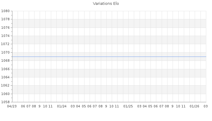 Date d'inscription : 27/02/23. Donateur pour EchecsEmail : Non ( Cliquez ici pour soutenir EchecsEmail. ) Elo non arrondi:1030 ( 544 sur 441 joueurs ) Nombre de victoires :2 Nombre de nulles :0 Nombre de défaites :10 Temps de réponse moyen par coup : 1J 2H 54M 36S ( Moyenne sur 0 coups ). Rd ( Un petit rd indique un elo fiable ) : 160 Elo maximum atteint ( en étant classé ) :0 Elo maximum atteint cette année :0 Nombre coups joués : 280 Classement coupe : Inactif Points coupe : 0 Classement Coupe Magic Chess : Inactif Points Coupe Magic Chess : 0 Tournoi échelle : Inactif. Nombre de tournois gagnés :0