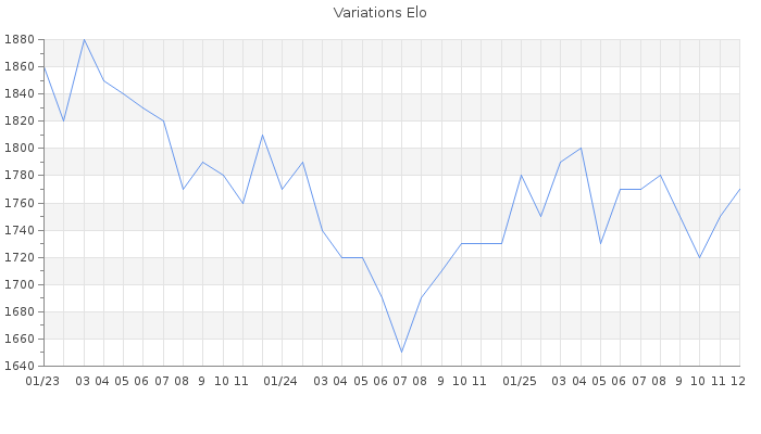 Date d'inscription : 12/09/16. Donateur pour EchecsEmail : Non ( Cliquez ici pour soutenir EchecsEmail. ) Elo non arrondi:1765.8 ( 244 sur 450 joueurs ) Nombre de victoires :290 Nombre de nulles :26 Nombre de défaites :231 Temps de réponse moyen par coup : 0J 3H 59M 10S ( Moyenne sur 968 coups ). Rd ( Un petit rd indique un elo fiable ) : 62 Magic Elo:1700 Magic Rd : 350 Elo maximum atteint ( en étant classé ) :1950 Elo maximum atteint cette année :1810 Nombre coups joués : 23850 Inscrit dans l' équipe:Fair play Classement coupe : Inactif Points coupe : 0 Classement Coupe Magic Chess : Inactif Points Coupe Magic Chess : 0 Tournoi échelle : Inactif. Tournois gagnés : 11/12/2025 : Cat 3 : Victoire dans le tournoi n°27232 05/09/2025 : Cat 3 : Victoire dans le tournoi n°26998 30/01/2025 : Cat 3 : Victoire dans le tournoi n°26264 12/01/2025 : Cat 3 : Victoire dans le tournoi n°26402 31/10/2024 : Cat 2 : Victoire dans le tournoi n°25957 06/01/2024 : Cat 3 : Victoire dans le tournoi n°25454 19/12/2023 : Cat 3 : Victoire dans le tournoi n°25417 14/12/2023 : Cat 3 : Victoire dans le tournoi n°25359 19/03/2023 : Cat 3 : Victoire dans le tournoi n°24721 16/02/2023 : Cat 3 : Victoire dans le tournoi n°24607 21/01/2023 : Cat 3 : Victoire dans le tournoi n°24587 14/01/2023 : Cat 3 : Victoire dans le tournoi n°24524 30/12/2022 : Cat 3 : Victoire dans le tournoi n°24509 06/08/2022 : Cat 3 : Victoire dans le tournoi n°24062 13/06/2022 : Cat 3 : Victoire dans le tournoi n°23941 18/03/2022 : Cat 3 : Victoire dans le tournoi n°23657 09/02/2022 : Cat 3 : Victoire dans le tournoi n°23583 Nombre de tournois gagnés :17