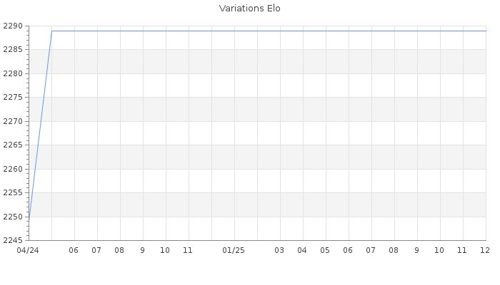 Date d'inscription : 18/04/24. Donateur pour EchecsEmail : Non ( Cliquez ici pour soutenir EchecsEmail. ) Elo non arrondi:2264.8 ( 50 sur 454 joueurs ) Nombre de victoires :6 Nombre de nulles :0 Nombre de défaites :0 Temps de réponse moyen par coup : 0J 4H 6M 38S ( Moyenne sur 6 coups ). Rd ( Un petit rd indique un elo fiable ) : 162 Magic Elo:1904.74 Magic Rd : 100 Elo maximum atteint ( en étant classé ) :0 Elo maximum atteint cette année :0 Nombre coups joués : 572 Classement coupe : Inactif Points coupe : 0 Classement Coupe Magic Chess : Inactif Points Coupe Magic Chess : 3.73 Tournoi échelle : Inactif. Nombre de tournois gagnés :0