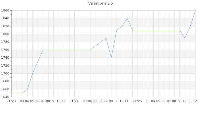 Date d'inscription : 13/02/18. Donateur pour EchecsEmail : Non ( Cliquez ici pour soutenir EchecsEmail. ) Elo non arrondi:1854.1 ( 210 sur 461 joueurs ) Nombre de victoires :187 Nombre de nulles :13 Nombre de défaites :47 Temps de réponse moyen par coup : 0J 2H 2M 27S ( Moyenne sur 325 coups ). Rd ( Un petit rd indique un elo fiable ) : 115 Elo maximum atteint ( en étant classé ) :1980 Elo maximum atteint cette année :1860 Nombre coups joués : 8622 Classement coupe : Inactif Points coupe : 0 Classement Coupe Magic Chess : Inactif Points Coupe Magic Chess : 0 Tournoi échelle : Inactif. Nombre de tournois gagnés :0