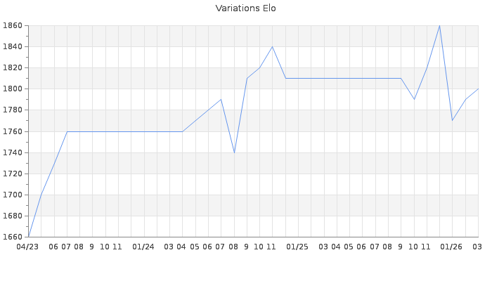 Date d'inscription : 13/02/18. Donateur pour EchecsEmail : Non ( Cliquez ici pour soutenir EchecsEmail. ) Elo non arrondi:1804.9 ( 224 sur 441 joueurs ) Nombre de victoires :194 Nombre de nulles :13 Nombre de défaites :49 Temps de réponse moyen par coup : 0J 2H 22M 31S ( Moyenne sur 328 coups ). Rd ( Un petit rd indique un elo fiable ) : 106 Elo maximum atteint ( en étant classé ) :1980 Elo maximum atteint cette année :1880 Nombre coups joués : 9017 Classement coupe : Inactif Points coupe : 0 Classement Coupe Magic Chess : Inactif Points Coupe Magic Chess : 0 Tournoi échelle : Inactif. Nombre de tournois gagnés :0