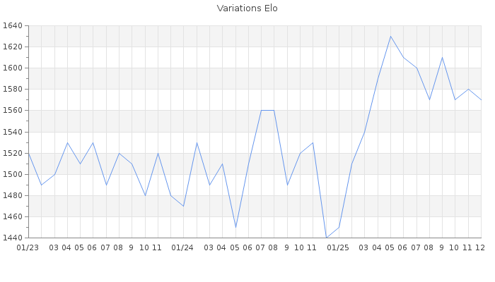 Date d'inscription : 28/11/12. Donateur pour EchecsEmail : Oui ( Cliquez ici pour soutenir EchecsEmail. ) Elo non arrondi:1574.2 ( 339 sur 449 joueurs ) Nombre de victoires :1908 Nombre de nulles :109 Nombre de défaites :1865 Temps de réponse moyen par coup : 0J 2H 31M 32S ( Moyenne sur 2190 coups ). Rd ( Un petit rd indique un elo fiable ) : 53 Magic Elo:1600 Magic Rd : 350 Elo maximum atteint ( en étant classé ) :1890 Elo maximum atteint cette année :1660 Nombre coups joués : 134408 Classement coupe : Inactif Points coupe : 0 Classement Coupe Magic Chess : Inactif Points Coupe Magic Chess : 0 Tournoi échelle : Inactif. Tournois gagnés : 30/04/2025 : Cat 2 : Victoire dans le tournoi n°26678 16/10/2024 : Cat 1 : Victoire dans le tournoi n°26128 14/10/2024 : Cat 1 : Victoire dans le tournoi n°26101 19/12/2023 : Cat 1 : Victoire dans le tournoi n°25406 04/12/2023 : Cat 1 : Victoire dans le tournoi n°25389 19/08/2023 : Cat 2 : Victoire dans le tournoi n°25061 02/05/2023 : Cat 1 : Victoire dans le tournoi n°24817 30/12/2022 : Cat 2 : Victoire dans le tournoi n°24493 30/12/2022 : Cat 1 : Victoire dans le tournoi n°24404 15/11/2022 : Cat 1 : Victoire dans le tournoi n°24403 11/11/2022 : Cat 2 : Victoire dans le tournoi n°24378 02/09/2022 : Cat 2 : Victoire dans le tournoi n°24152 24/04/2022 : Cat 2 : Victoire dans le tournoi n°23817 30/01/2022 : Cat 2 : Victoire dans le tournoi n°23588 21/01/2022 : Cat 2 : Victoire dans le tournoi n°23525 27/12/2021 : Cat 2 : Victoire dans le tournoi n°23411 19/10/2021 : Cat 2 : Victoire dans le tournoi n°23207 21/09/2021 : Cat 2 : Victoire dans le tournoi n°23123 05/10/2020 : Cat 2 : Victoire dans le tournoi n°21773 10/09/2020 : Cat 2 : Victoire dans le tournoi n°21610 13/06/2020 : Cat 2 : Victoire dans le tournoi n°21028 09/05/2020 : Cat 2 : Victoire dans le tournoi n°21109 08/04/2020 : Cat 2 : Victoire dans le tournoi n°20970 25/02/2020 : Cat 2 : Victoire dans le tournoi n°20685 08/01/2020 : Cat 2 : Victoire dans le tournoi n°20532 28/11/2019 : Cat 2 : Victoire dans le tournoi n°20347 25/07/2019 : Cat 2 : Victoire dans le tournoi n°19875 15/02/2019 : Cat 2 : Victoire dans le tournoi n°19228 23/01/2019 : Cat 2 : Victoire dans le tournoi n°19190 12/01/2019 : Cat 2 : Victoire dans le tournoi n°19090 12/12/2018 : Cat 2 : Victoire dans le tournoi n°18991 22/05/2018 : Cat 1 : Premier au tournoi multi Saint-Valentin 2018 n°6 17/04/2018 : Cat 2 : Victoire dans le tournoi n°17710 12/12/2017 : Cat 2 : Victoire dans le tournoi n°17406 14/11/2017 : Cat 2 : Victoire dans le tournoi n°17308 17/09/2017 : Cat 2 : Victoire dans le tournoi n°17062 14/09/2017 : Cat 2 : Victoire dans le tournoi n°16977 02/12/2016 : Cat 2 : Victoire dans le tournoi n°14995 01/12/2016 : Cat 2 : Victoire dans le tournoi n°15738 24/10/2016 : Cat 2 : Victoire dans le tournoi n°15436 07/01/2016 : Cat 2 : Victoire dans le tournoi n°18986 09/08/2015 : Cat 2 : Victoire dans le tournoi n°18121 20/06/2015 : Cat 2 : Victoire dans le tournoi n°17868 26/05/2015 : Cat 2 : Victoire dans le tournoi n°17685 01/04/2015 : Cat 2 : Victoire dans le tournoi n°17325 26/03/2015 : Cat 2 : Victoire dans le tournoi n°17201 26/03/2015 : Cat 2 : Victoire dans le tournoi n°16979 11/01/2015 : Cat 2 : Victoire dans le tournoi n°16769 01/01/2015 : Cat 3 : Victoire dans le tournoi n°16788 23/12/2014 : Cat 2 : Victoire dans le tournoi n°16724 21/12/2014 : Cat 2 : Victoire dans le tournoi n°16629 12/12/2014 : Cat 2 : Victoire dans le tournoi n°16602 15/10/2014 : Cat 2 : Victoire dans le tournoi n°16210 11/10/2014 : Cat 2 : Victoire dans le tournoi n°16065 03/09/2014 : Cat 2 : Victoire dans le tournoi n°15977 29/08/2014 : Cat 3 : Victoire dans le tournoi n°15556 11/01/2014 : Cat 3 : Victoire dans le tournoi n°14286 Nombre de tournois gagnés :57
