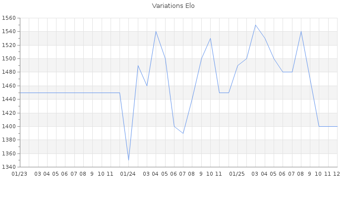 Date d'inscription : 29/07/21. Donateur pour EchecsEmail : Non ( Cliquez ici pour soutenir EchecsEmail. ) Elo non arrondi:1401.5 ( 412 sur 450 joueurs ) Nombre de victoires :481 Nombre de nulles :20 Nombre de défaites :424 Temps de réponse moyen par coup : 0J 8H 40M 56S ( Moyenne sur 777 coups ). Rd ( Un petit rd indique un elo fiable ) : 54 Magic Elo:1700 Magic Rd : 350 Elo maximum atteint ( en étant classé ) :1660 Elo maximum atteint cette année :1610 Nombre coups joués : 20080 Inscrit dans l' équipe:fouschess Classement coupe : 147 Points coupe : 10.56 Classement Coupe Magic Chess : Inactif Points Coupe Magic Chess : 0 Tournoi échelle : Inactif. Tournois gagnés : 17/09/2025 : Cat 1 : Victoire dans le tournoi n°26942 11/09/2025 : Cat 2 : Victoire dans le tournoi n°27043 04/09/2025 : Cat 1 : Victoire dans le tournoi n°26933 29/08/2025 : Cat 2 : Victoire dans le tournoi n°26991 20/08/2025 : Cat 1 : Victoire dans le tournoi n°26963 19/08/2025 : Cat 1 : Victoire dans le tournoi n°26936 03/08/2025 : Cat 1 : Victoire dans le tournoi n°26910 19/07/2025 : Cat 1 : Victoire dans le tournoi n°26895 17/07/2025 : Cat 2 : Victoire dans le tournoi n°26699 10/07/2025 : Cat 1 : Victoire dans le tournoi n°26782 18/04/2025 : Cat 1 : Victoire dans le tournoi n°26611 29/03/2025 : Cat 2 : Victoire dans le tournoi n°26602 27/03/2025 : Cat 1 : Victoire dans le tournoi n°26582 14/03/2025 : Cat 1 : Victoire dans le tournoi n°26547 13/03/2025 : Cat 1 : Victoire dans le tournoi n°26421 05/03/2025 : Cat 1 : Victoire dans le tournoi n°26472 09/02/2025 : Cat 1 : Victoire dans le tournoi n°26459 27/01/2025 : Cat 1 : Victoire dans le tournoi n°26432 21/10/2024 : Cat 1 : Victoire dans le tournoi n°26105 20/10/2024 : Cat 1 : Victoire dans le tournoi n°26042 01/10/2024 : Cat 2 : Victoire dans le tournoi n°26063 23/09/2024 : Cat 1 : Victoire dans le tournoi n°25968 05/09/2024 : Cat 1 : Victoire dans le tournoi n°25981 05/06/2024 : Cat 2 : Victoire dans le tournoi n°25725 14/05/2024 : Cat 1 : Victoire dans le tournoi n°25589 05/04/2024 : Cat 1 : Victoire dans le tournoi n°25653 27/03/2024 : Cat 1 : Victoire dans le tournoi n°25637 14/03/2024 : Cat 1 : Victoire dans le tournoi n°25641 06/03/2024 : Cat 1 : Victoire dans le tournoi n°25601 03/03/2024 : Cat 1 : Victoire dans le tournoi n°25614 18/02/2024 : Cat 1 : Victoire dans le tournoi n°25586 05/11/2022 : Cat 2 : Victoire dans le tournoi n°24373 31/10/2022 : Cat 2 : Victoire dans le tournoi n°24359 23/01/2022 : Cat 2 : Victoire dans le tournoi n°23558 21/01/2022 : Cat 2 : Victoire dans le tournoi n°23422 10/01/2022 : Cat 2 : Victoire dans le tournoi n°23468 10/01/2022 : Cat 2 : Victoire dans le tournoi n°23431 21/09/2021 : Cat 2 : Victoire dans le tournoi n°23094 30/08/2021 : Cat 1 : Victoire dans le tournoi n°23057 24/08/2021 : Cat 1 : Victoire dans le tournoi n°23078 Nombre de tournois gagnés :40