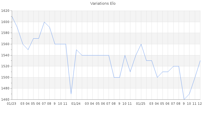 Date d'inscription : 27/12/14. Donateur pour EchecsEmail : Non ( Cliquez ici pour soutenir EchecsEmail. ) Elo non arrondi:1534.6 ( 360 sur 449 joueurs ) Nombre de victoires :255 Nombre de nulles :33 Nombre de défaites :309 Temps de réponse moyen par coup : 0J 1H 25M 53S ( Moyenne sur 348 coups ). Rd ( Un petit rd indique un elo fiable ) : 82 Magic Elo:1600 Magic Rd : 350 Elo maximum atteint ( en étant classé ) :1660 Elo maximum atteint cette année :1560 Nombre coups joués : 26483 Classement coupe : Inactif Points coupe : 0 Classement Coupe Magic Chess : Inactif Points Coupe Magic Chess : 0 Tournoi échelle : Inactif. Tournois gagnés : 07/11/2024 : Cat 2 : Victoire dans le tournoi n°26189 26/12/2022 : Cat 2 : Victoire dans le tournoi n°24504 17/11/2022 : Cat 1 : Victoire dans le tournoi n°24391 14/02/2022 : Cat 2 : Victoire dans le tournoi n°23592 12/11/2021 : Cat 2 : Victoire dans le tournoi n°23278 28/10/2020 : Cat 2 : Victoire dans le tournoi n°21820 02/04/2020 : Cat 2 : Victoire dans le tournoi n°21011 12/02/2020 : Cat 2 : Victoire dans le tournoi n°20638 11/12/2018 : Cat 2 : Victoire dans le tournoi n°19020 06/03/2018 : Cat 2 : Victoire dans le tournoi n°17732 22/06/2017 : Cat 2 : Victoire dans le tournoi n°16664 14/11/2016 : Cat 2 : Victoire dans le tournoi n°15524 28/04/2016 : Cat 2 : Victoire dans le tournoi n°14726 08/03/2016 : Cat 2 : Victoire dans le tournoi n°14420 Nombre de tournois gagnés :14