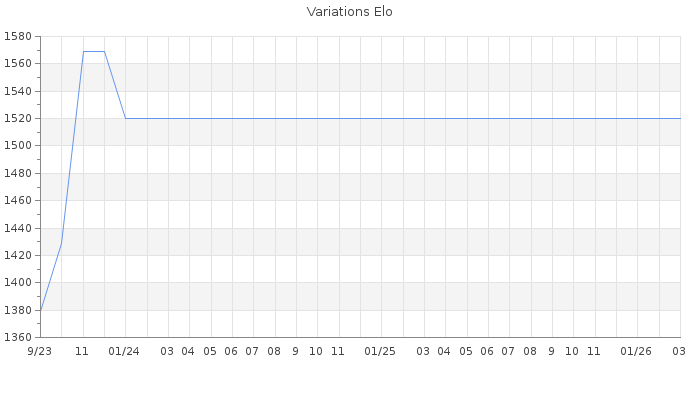 Date d'inscription : 14/09/23. Donateur pour EchecsEmail : Non ( Cliquez ici pour soutenir EchecsEmail. ) Elo non arrondi:1482.8 ( 417 sur 438 joueurs ) Nombre de victoires :4 Nombre de nulles :1 Nombre de défaites :7 Temps de réponse moyen par coup : 0J 2H 58M 25S ( Moyenne sur 0 coups ). Rd ( Un petit rd indique un elo fiable ) : 128 Elo maximum atteint ( en étant classé ) :1540 Elo maximum atteint cette année :0 Nombre coups joués : 356 Classement coupe : Inactif Points coupe : 0 Classement Coupe Magic Chess : Inactif Points Coupe Magic Chess : 0 Tournoi échelle : Nombre de tournois gagnés :0